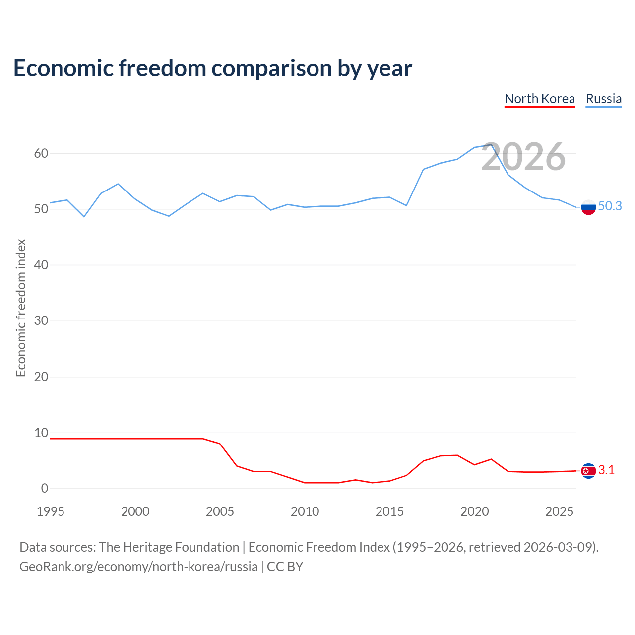 The Economic Freedom Index for North Korea is 3.1, ranking 197/197, compared to 50.3 for Russia, ranking 161/197. The chart above displays a comparison of annual changes in economic freedom indexes.