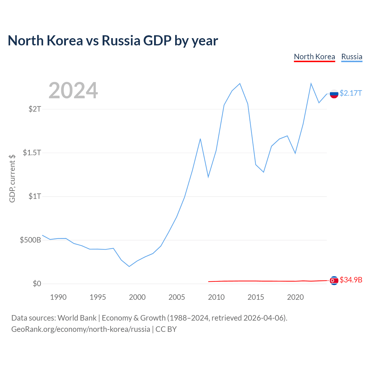 North Korea has a GDP of $34.9B compared to $2.17T for Russia, ranking 106/197 and 11/197 by economy size, respectively.