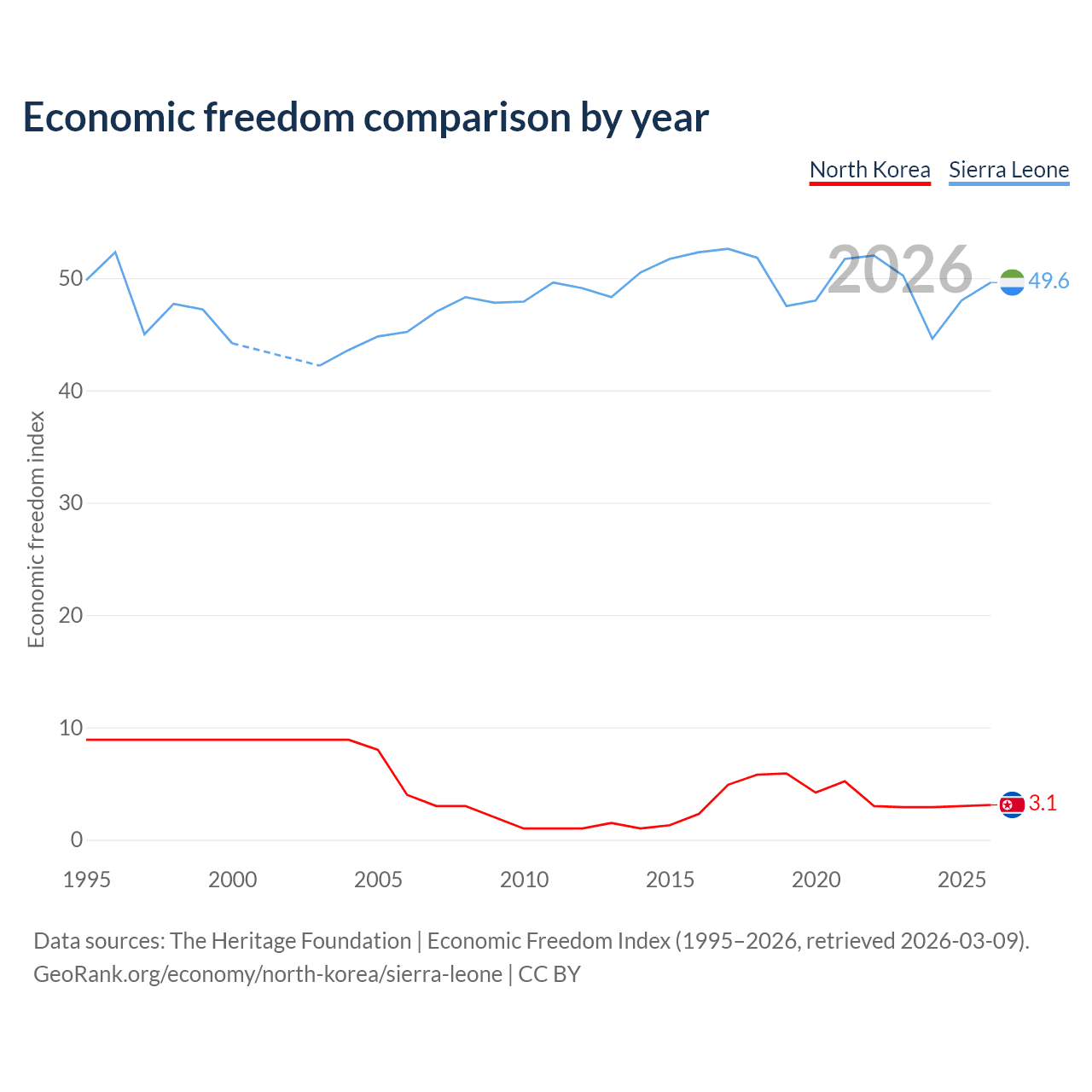 The Economic Freedom Index for North Korea is 3.1, ranking 197/197, compared to 49.6 for Sierra Leone, ranking 165/197. The chart above displays a comparison of annual changes in economic freedom indexes.