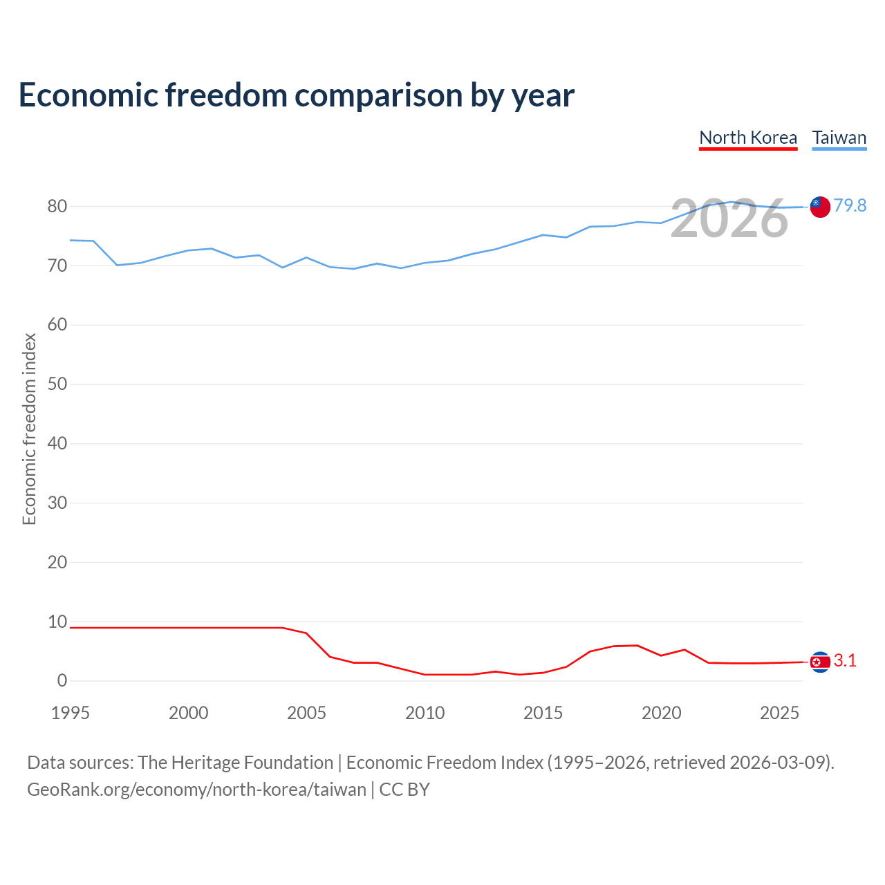 The Economic Freedom Index for North Korea is 3.1, ranking 197/197, compared to 79.8 for Taiwan, ranking 6/197. The chart above displays a comparison of annual changes in economic freedom indexes.