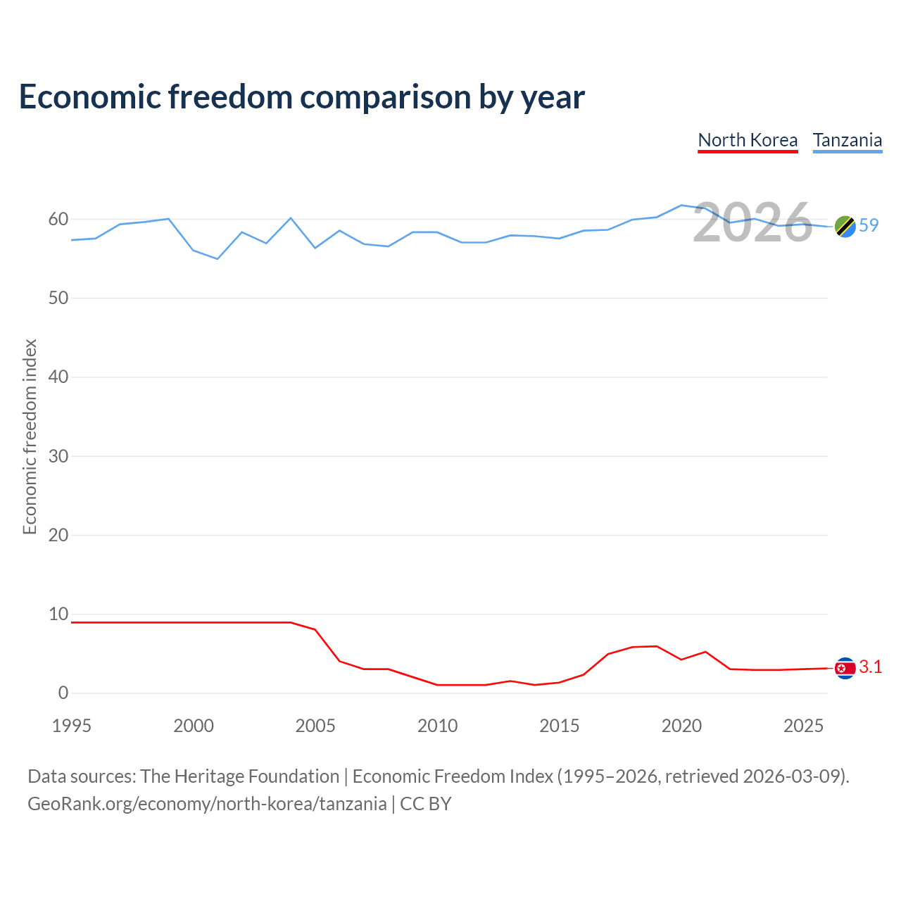 The Economic Freedom Index for North Korea is 3.1, ranking 197/197, compared to 59 for Tanzania, ranking 106/197. The chart above displays a comparison of annual changes in economic freedom indexes.