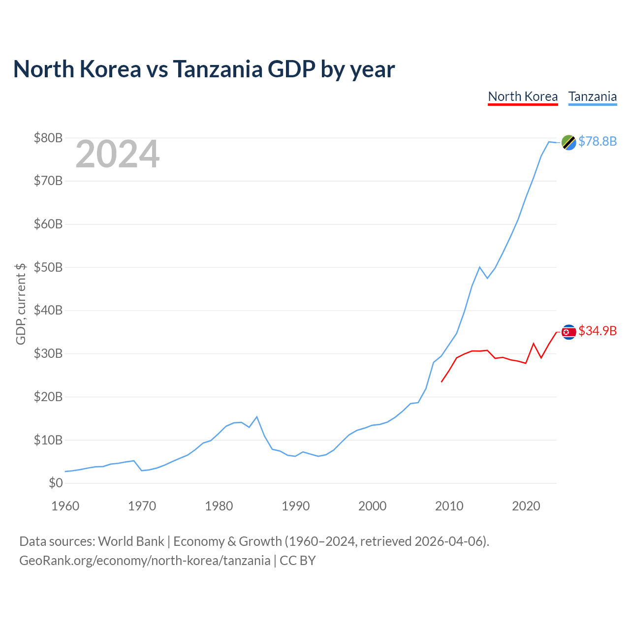 North Korea has a GDP of $34.9B compared to $78.8B for Tanzania, ranking 106/197 and 82/197 by economy size, respectively.