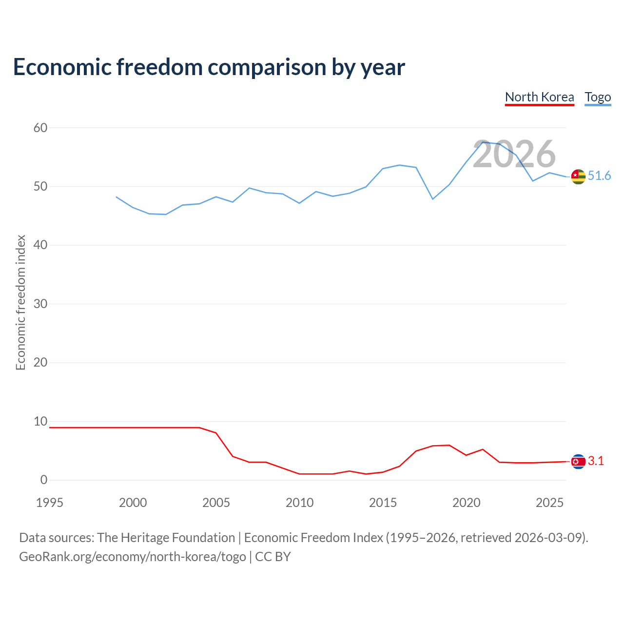 The Economic Freedom Index for North Korea is 3.1, ranking 197/197, compared to 51.6 for Togo, ranking 153/197. The chart above displays a comparison of annual changes in economic freedom indexes.
