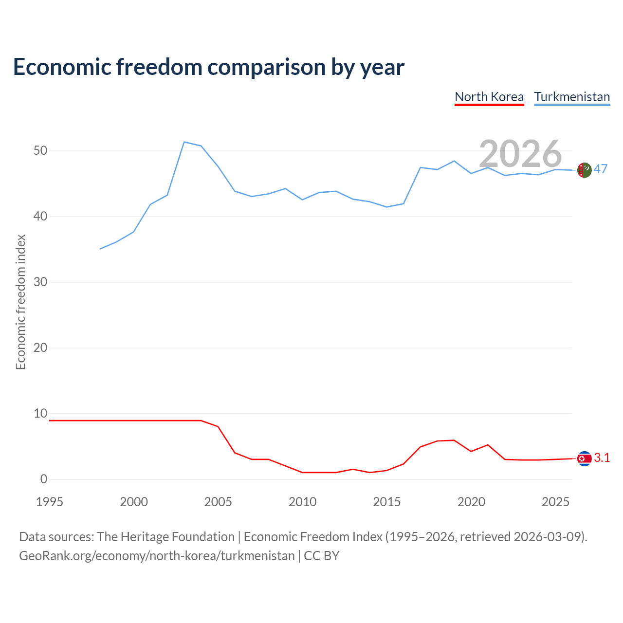 The Economic Freedom Index for North Korea is 3.1, ranking 197/197, compared to 47 for Turkmenistan, ranking 177/197. The chart above displays a comparison of annual changes in economic freedom indexes.
