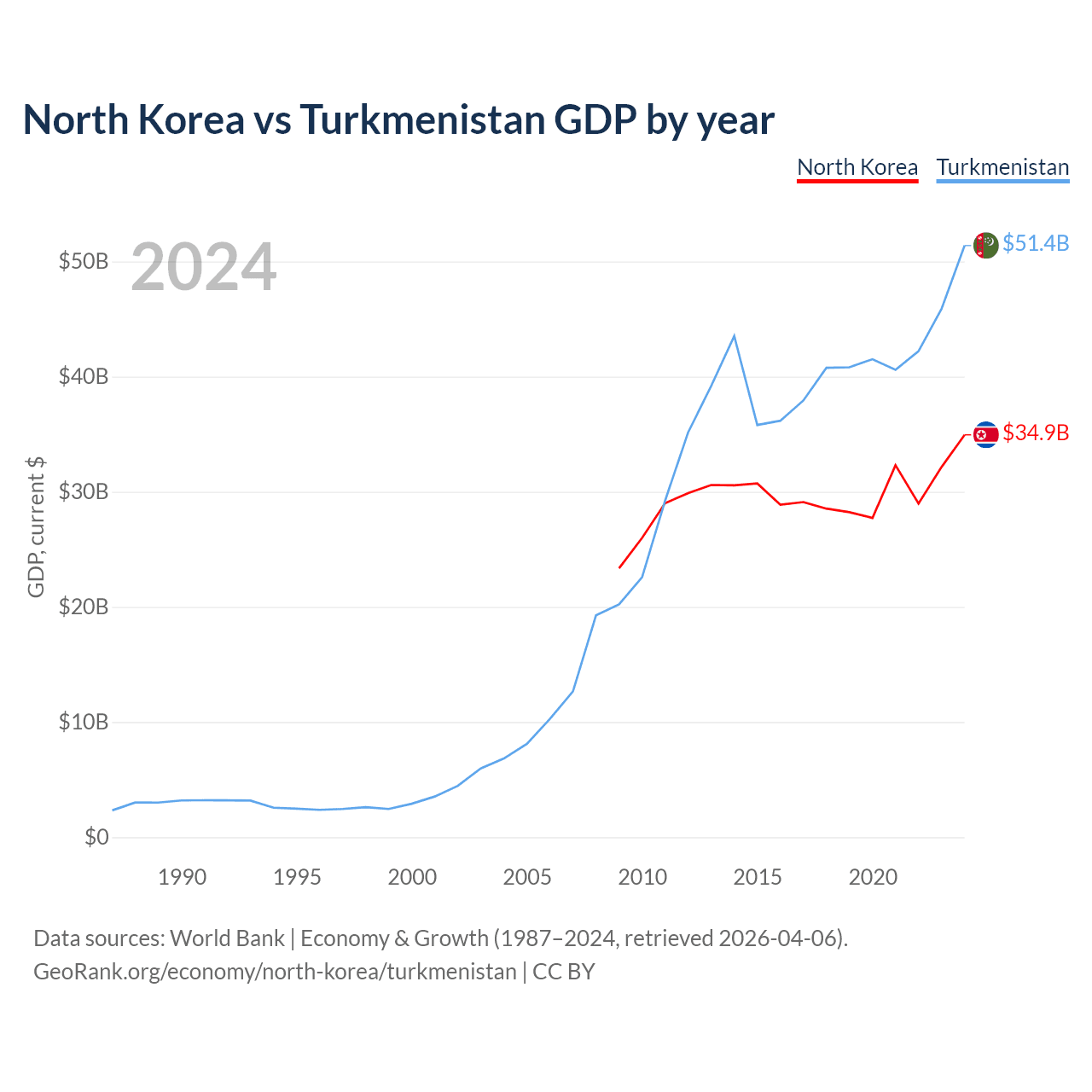 North Korea has a GDP of $34.9B compared to $51.4B for Turkmenistan, ranking 106/197 and 92/197 by economy size, respectively.
