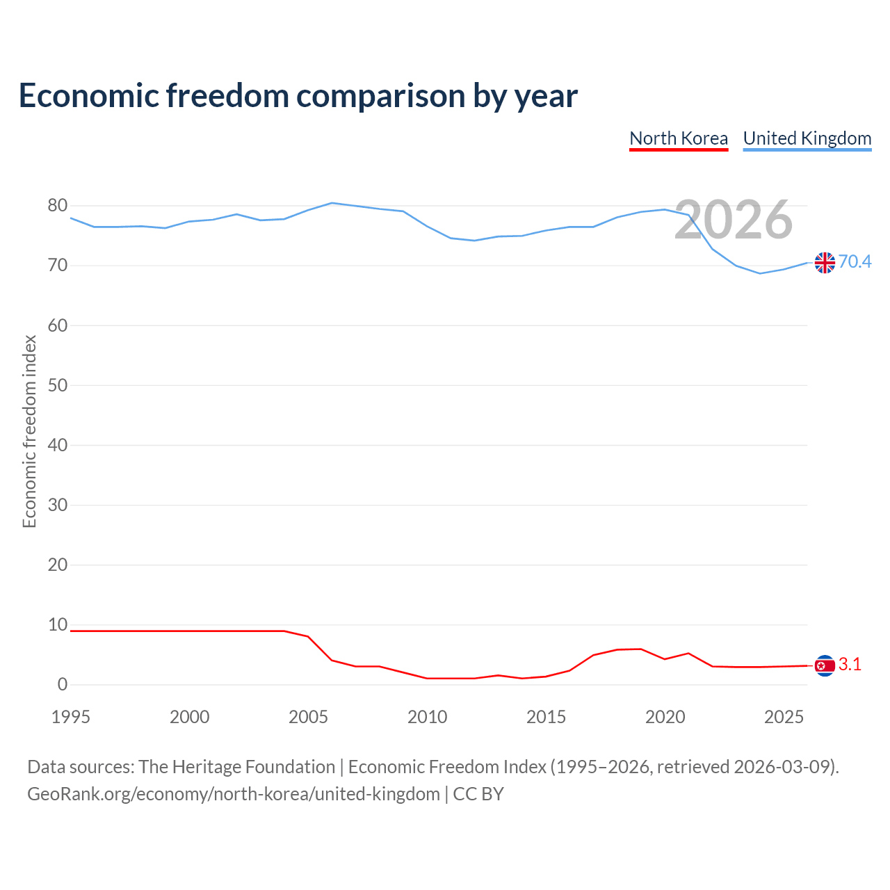 The Economic Freedom Index for North Korea is 3.1, ranking 197/197, compared to 70.4 for the United Kingdom, ranking 35/197. The chart above displays a comparison of annual changes in economic freedom indexes.