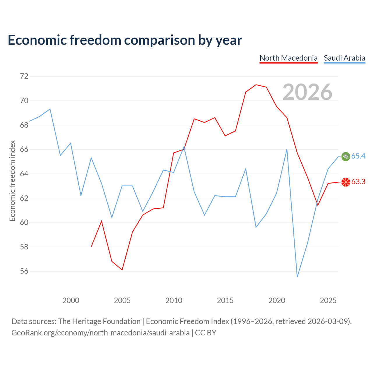 The Economic Freedom Index for North Macedonia is 63.3, ranking 81/197, compared to 65.4 for Saudi Arabia, ranking 65/197. The chart above displays a comparison of annual changes in economic freedom indexes.