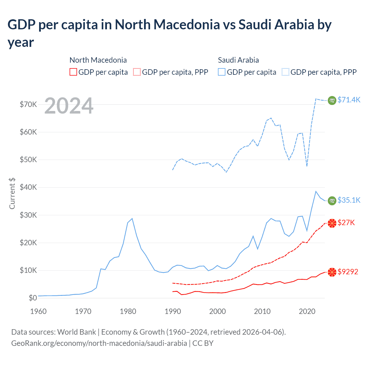 GDP per capita in North Macedonia vs Saudi Arabia by year