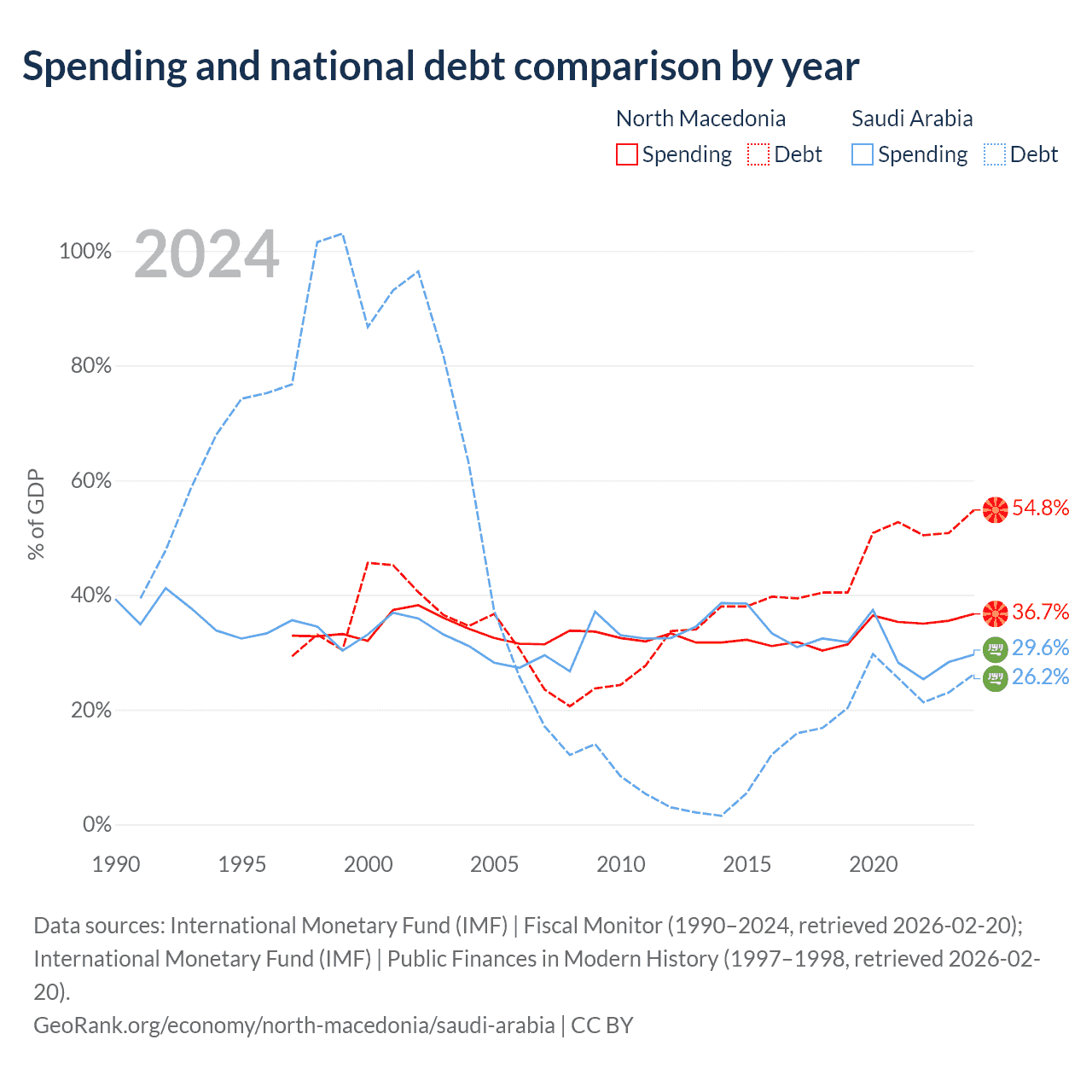 North Macedonia has $9.3B in government debt (54.8% of GDP), compared to $324B (26.2% of GDP) in Saudi Arabia.