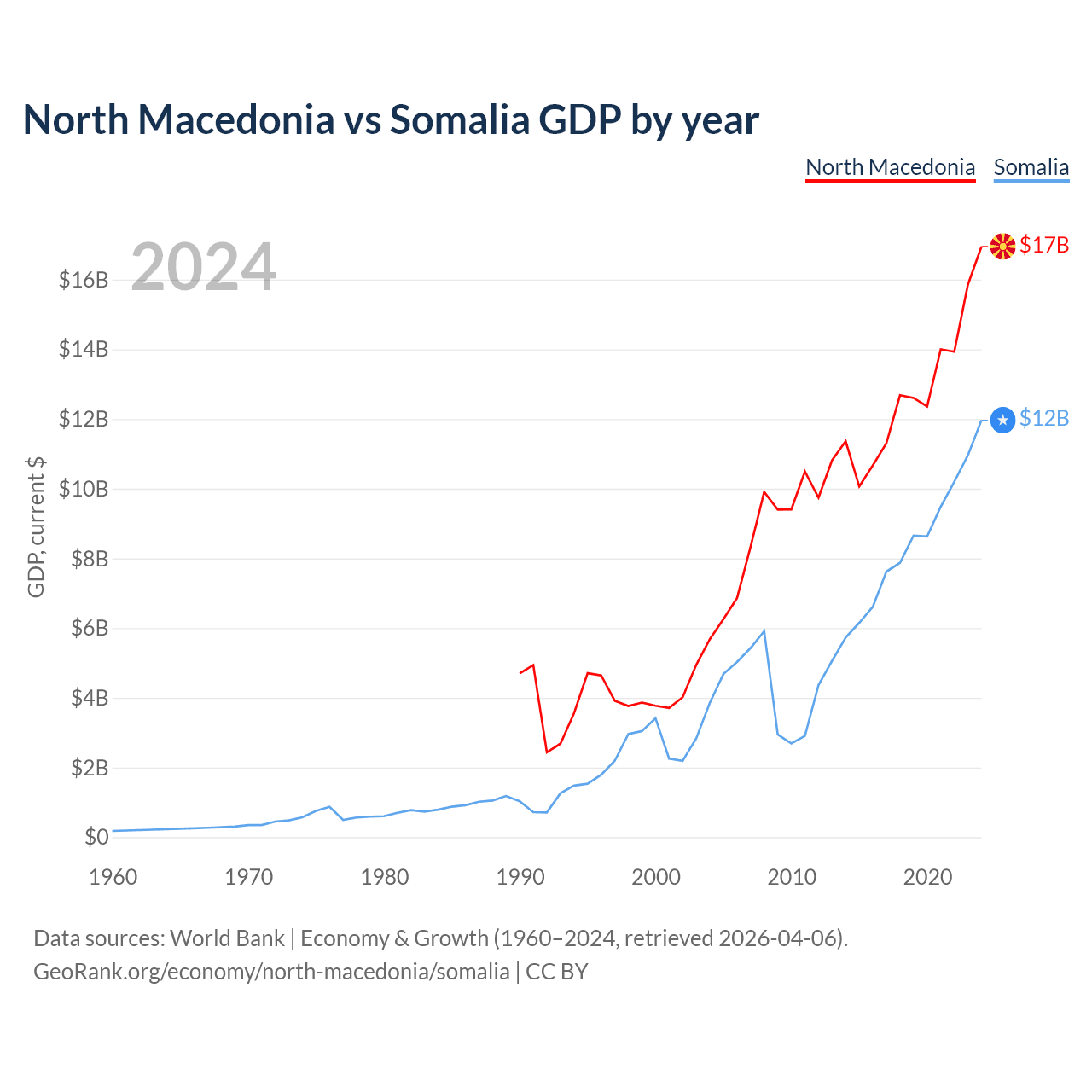 North Macedonia has a GDP of $17B compared to $12B for Somalia, ranking 138/197 and 150/197 by economy size, respectively.