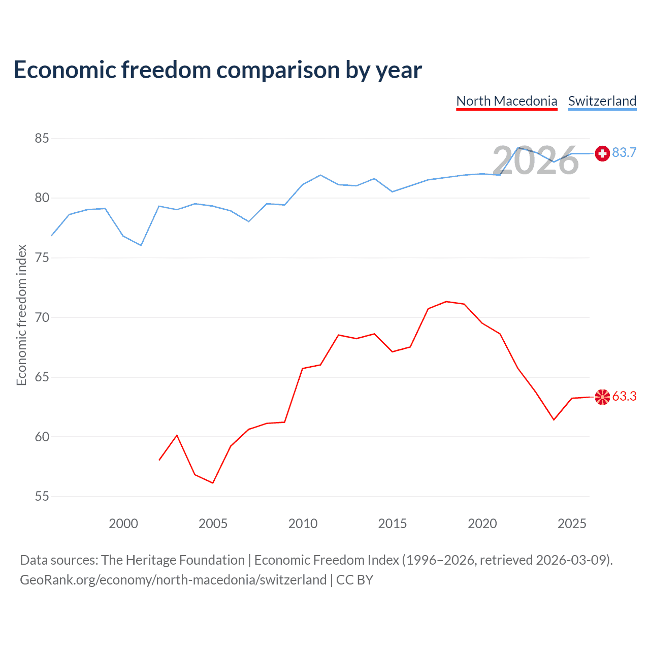 The Economic Freedom Index for North Macedonia is 63.3, ranking 81/197, compared to 83.7 for Switzerland, ranking 2/197. The chart above displays a comparison of annual changes in economic freedom indexes.