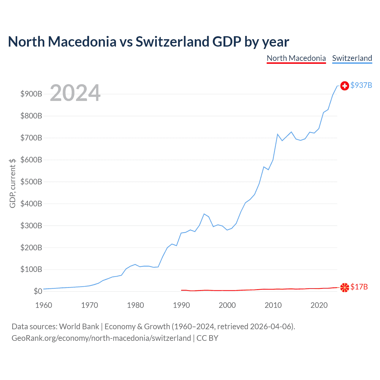 North Macedonia has a GDP of $17B compared to $937B for Switzerland, ranking 138/197 and 20/197 by economy size, respectively.