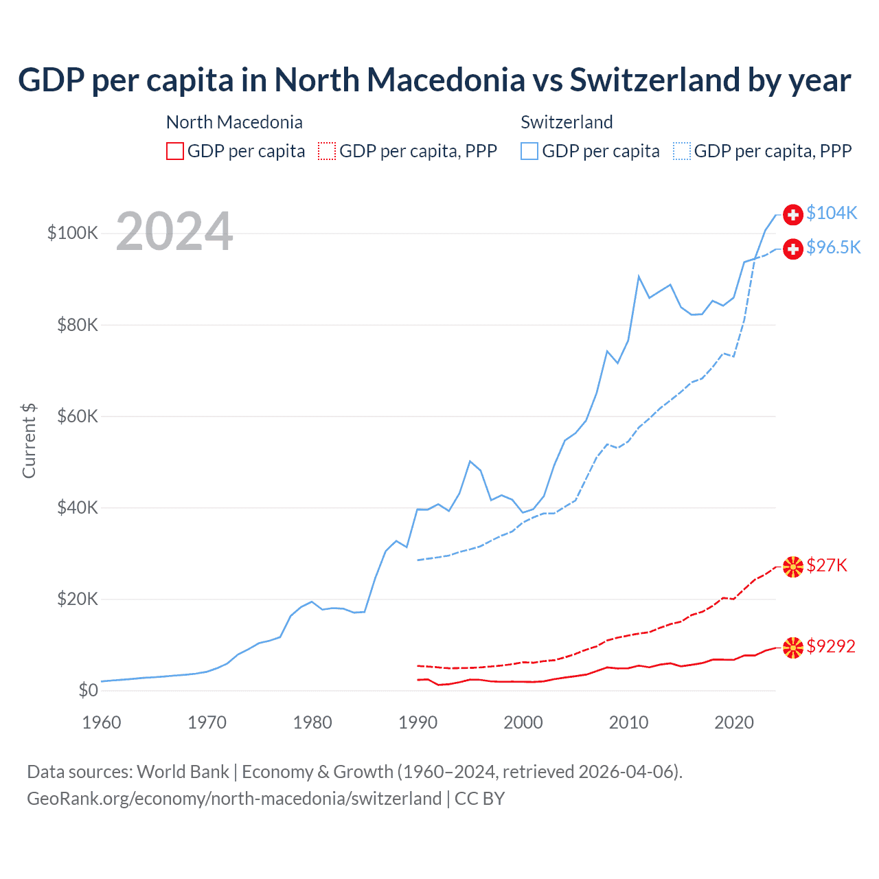 GDP per capita in North Macedonia vs Switzerland by year