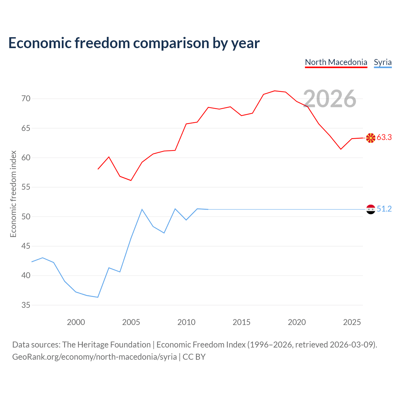 The Economic Freedom Index for North Macedonia is 63.3, ranking 81/197, compared to 51.2 for Syria, ranking 155/197. The chart above displays a comparison of annual changes in economic freedom indexes.