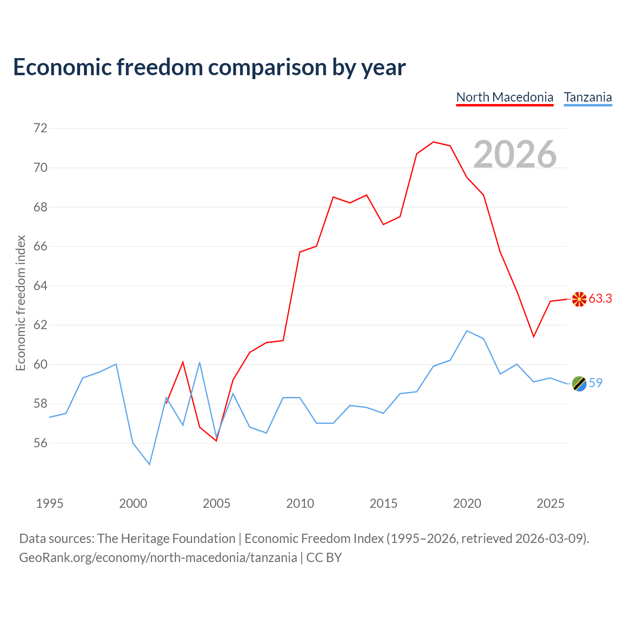 The Economic Freedom Index for North Macedonia is 63.3, ranking 81/197, compared to 59 for Tanzania, ranking 106/197. The chart above displays a comparison of annual changes in economic freedom indexes.
