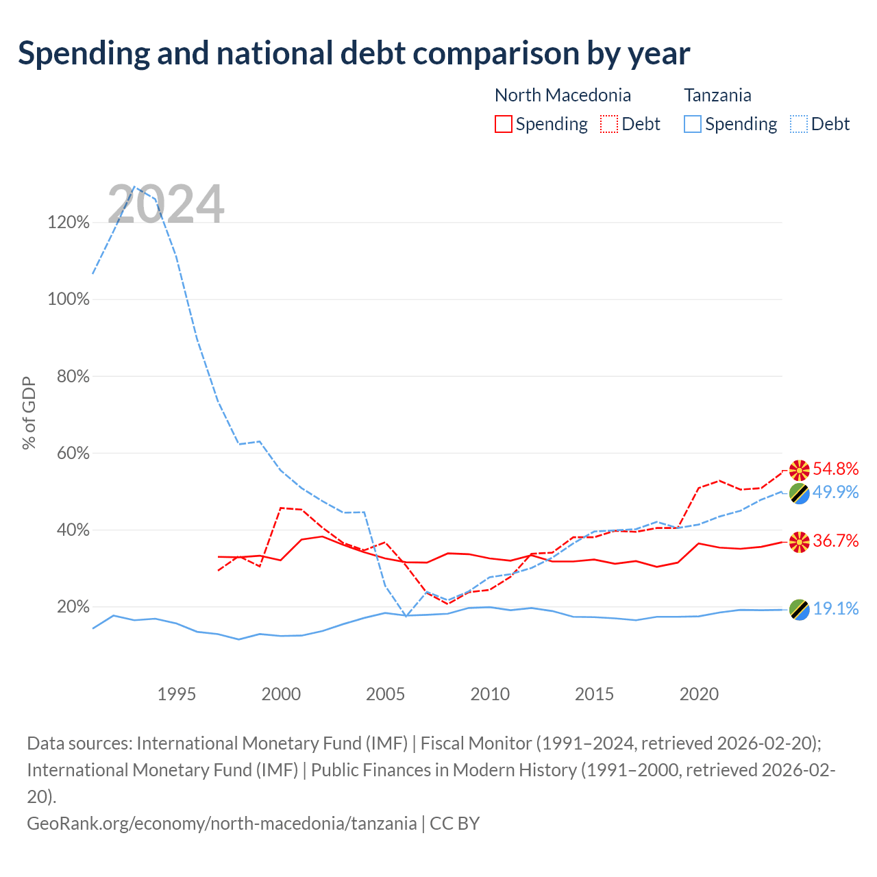 North Macedonia has $9.3B in government debt (54.8% of GDP), compared to $39.3B (49.9% of GDP) in Tanzania.