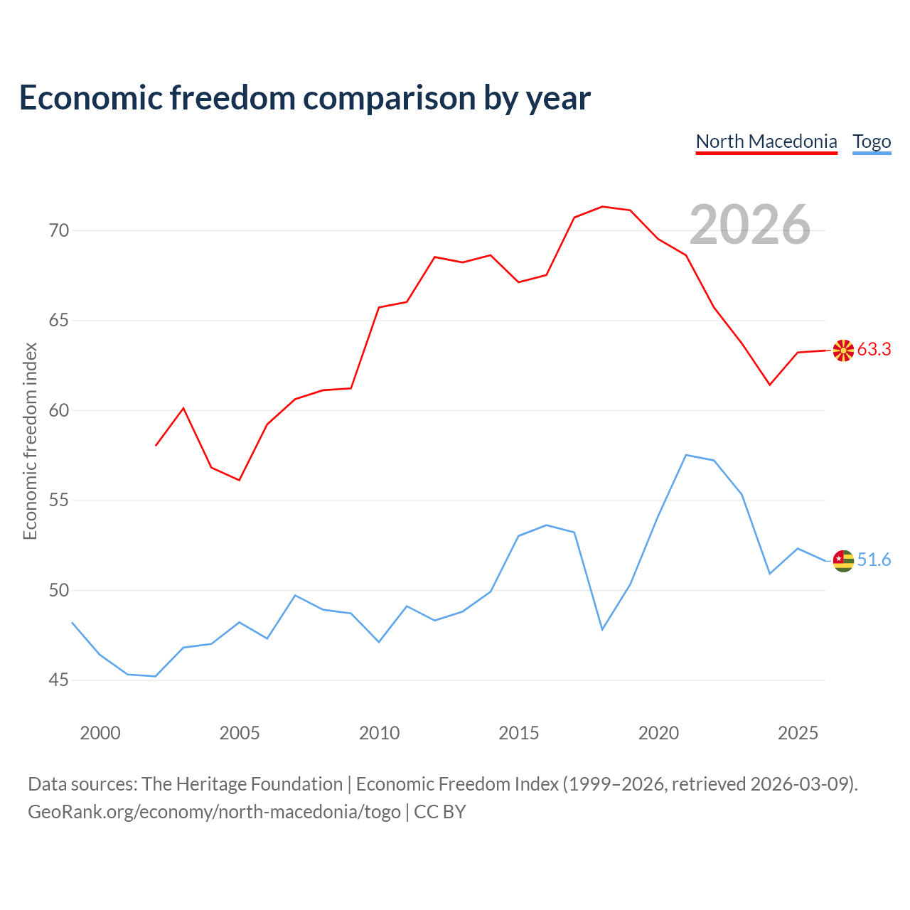 The Economic Freedom Index for North Macedonia is 63.3, ranking 81/197, compared to 51.6 for Togo, ranking 153/197. The chart above displays a comparison of annual changes in economic freedom indexes.