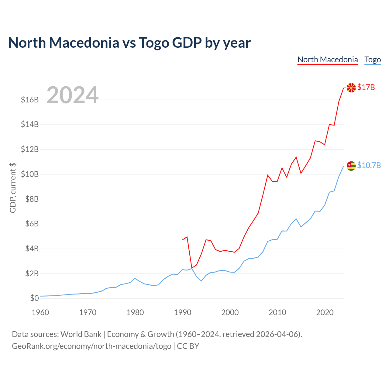 North Macedonia has a GDP of $17B compared to $10.7B for Togo, ranking 138/197 and 154/197 by economy size, respectively.