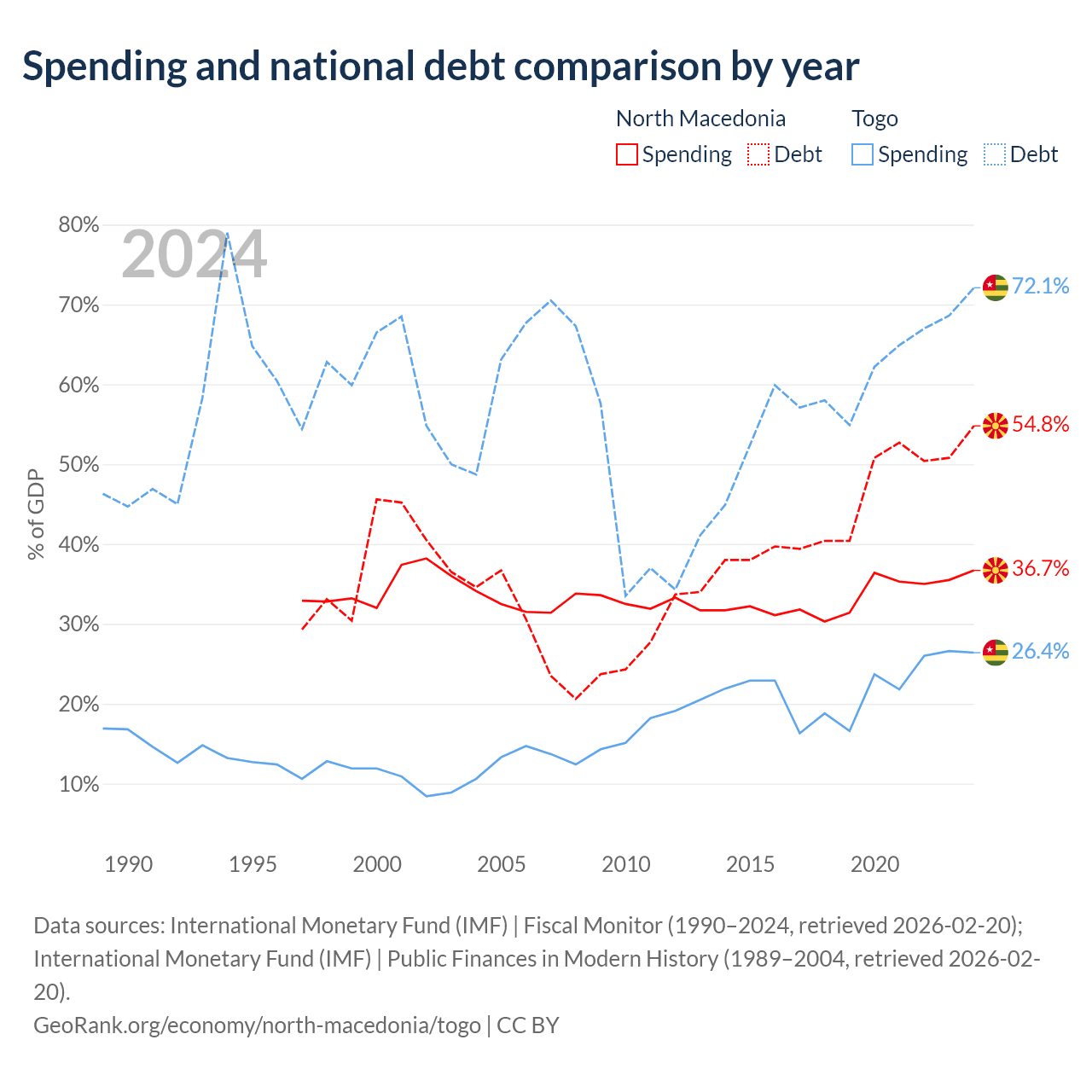 North Macedonia has $9.3B in government debt (54.8% of GDP), compared to $7.68B (72.1% of GDP) in Togo.