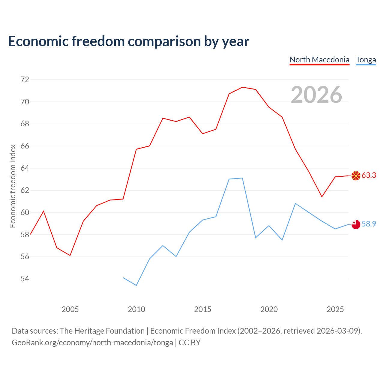 The Economic Freedom Index for North Macedonia is 63.3, ranking 81/197, compared to 58.9 for Tonga, ranking 107/197. The chart above displays a comparison of annual changes in economic freedom indexes.