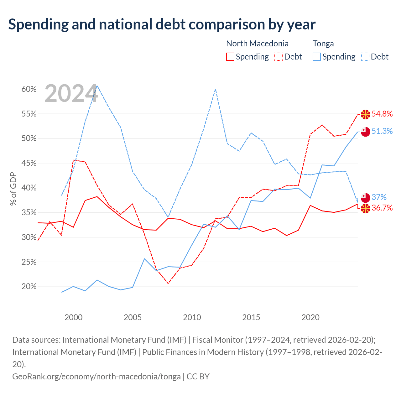 North Macedonia has $9.3B in government debt (54.8% of GDP), compared to $256M (37% of GDP) in Tonga.
