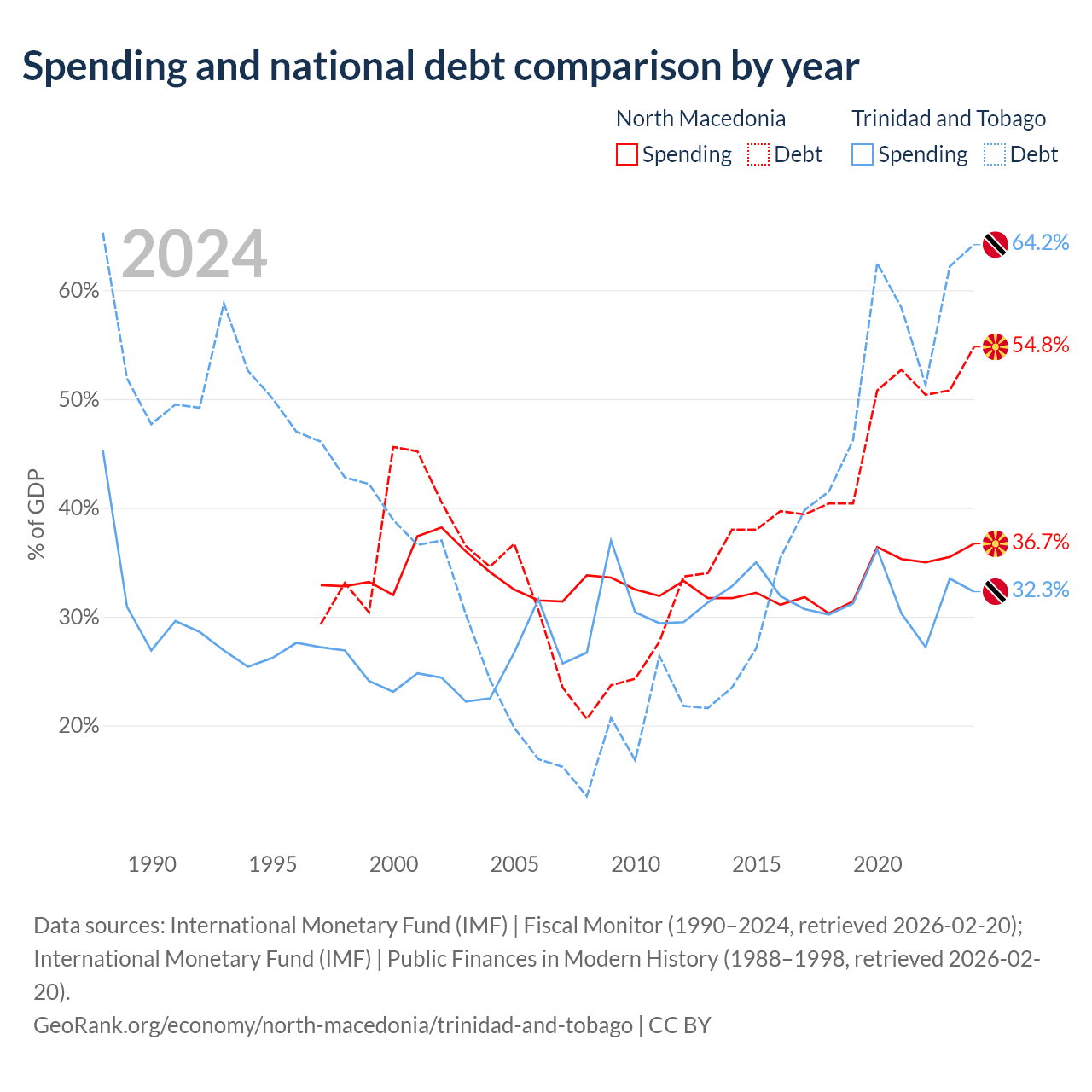 North Macedonia has $9.3B in government debt (54.8% of GDP), compared to $16.5B (64.2% of GDP) in Trinidad and Tobago.