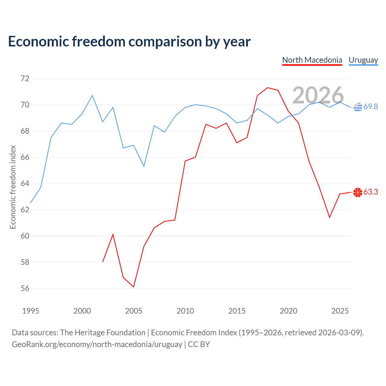 Data sources: The Heritage Foundation | Economic Freedom Index (1995–2026, retrieved 2026-03-09).