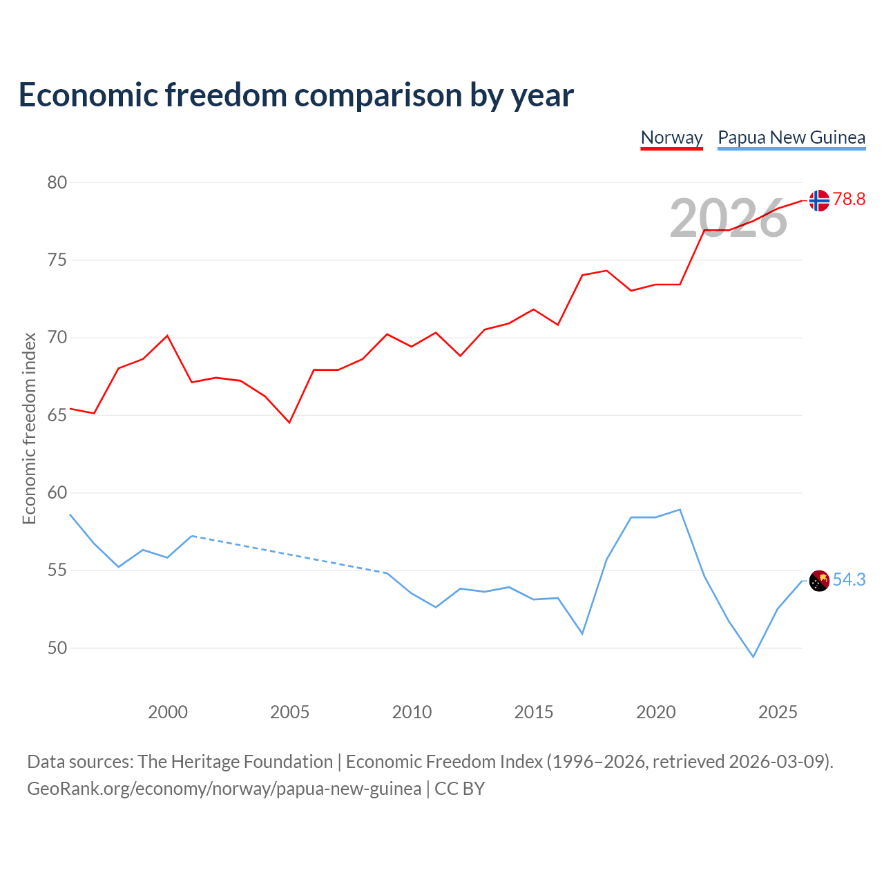 The Economic Freedom Index for Norway is 78.8, ranking 9/197, compared to 54.3 for Papua New Guinea, ranking 134/197. The chart above displays a comparison of annual changes in economic freedom indexes.