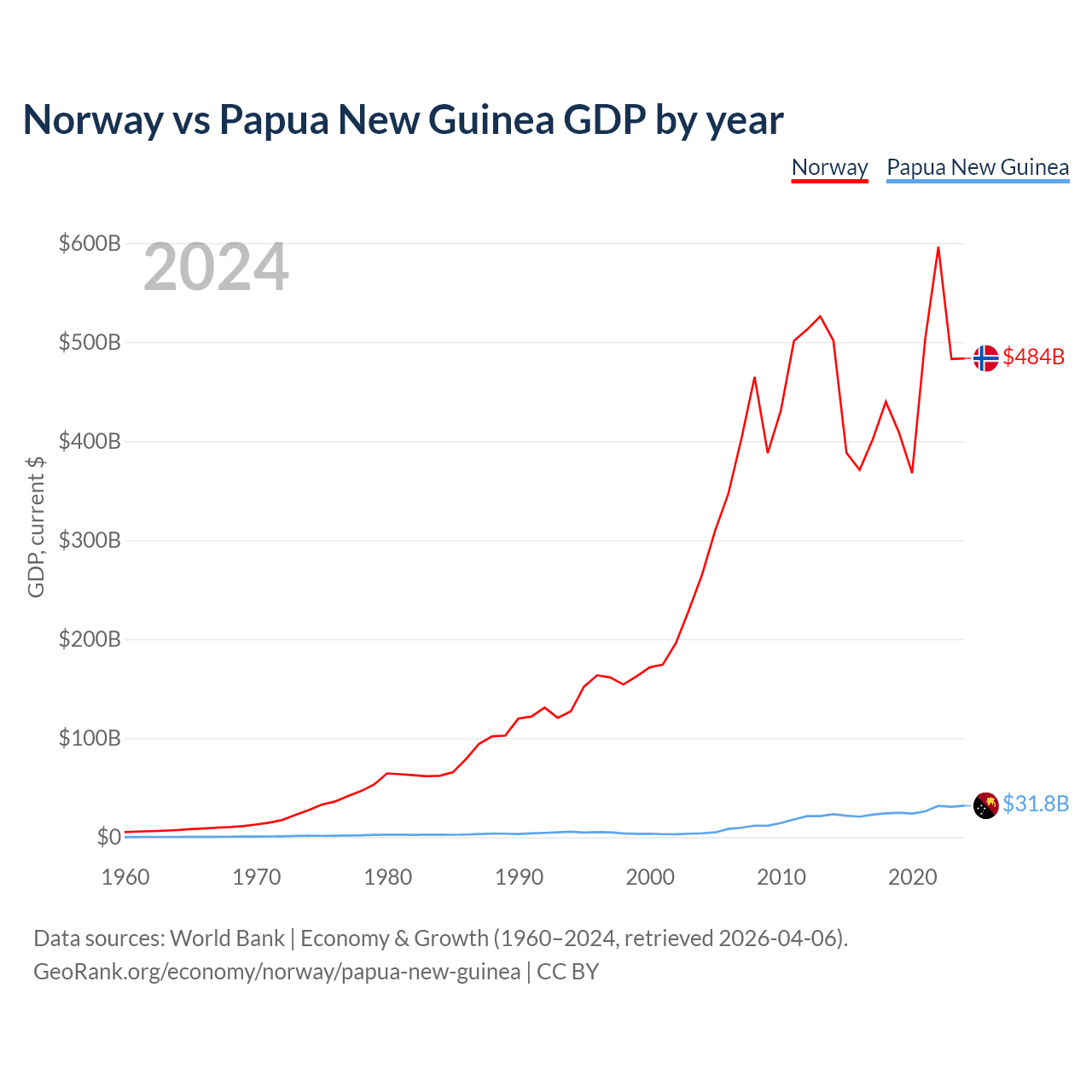 Norway has a GDP of $484B compared to $31.8B for Papua New Guinea, ranking 32/197 and 110/197 by economy size, respectively.