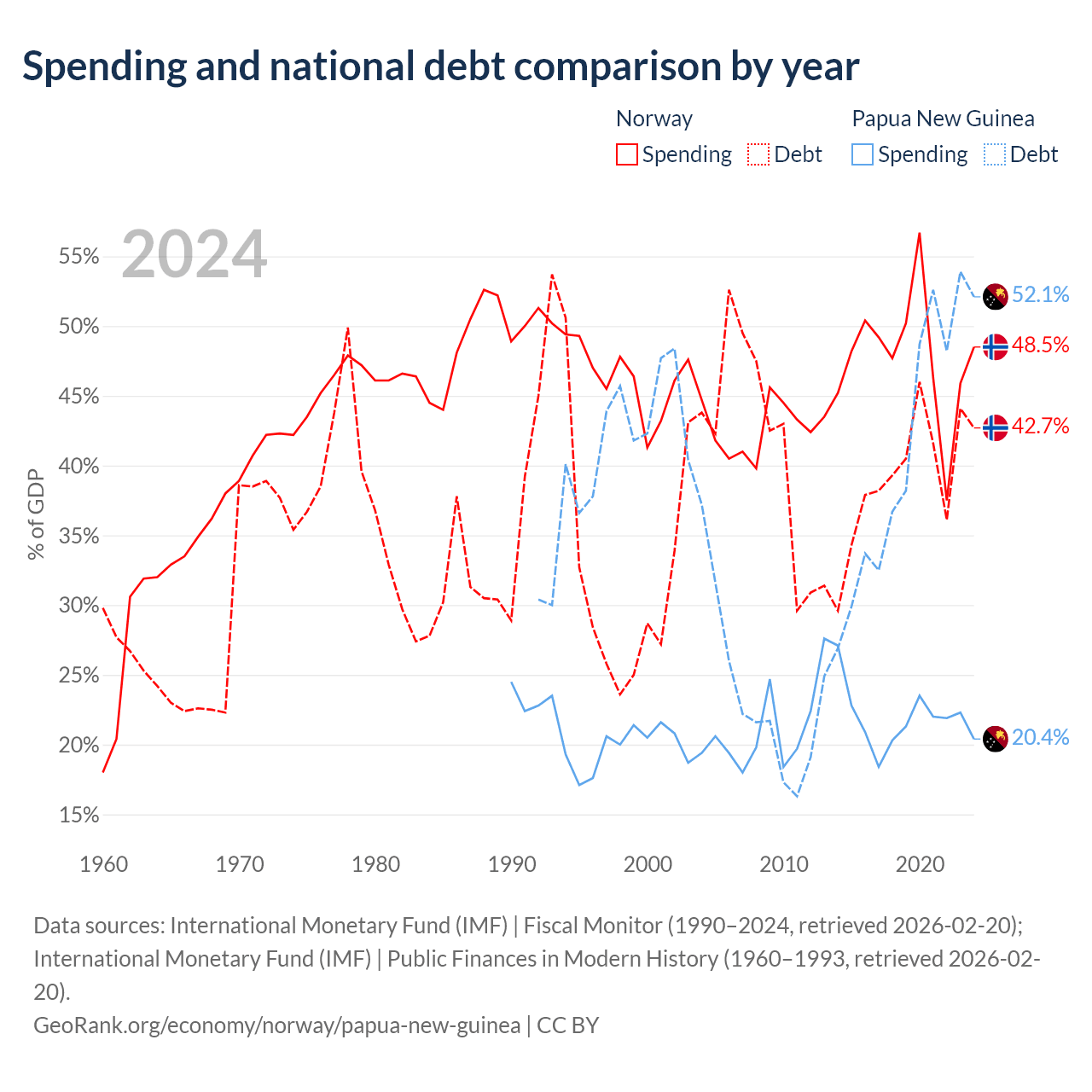 Norway has $207B in government debt (42.7% of GDP), compared to $16.6B (52.1% of GDP) in Papua New Guinea.