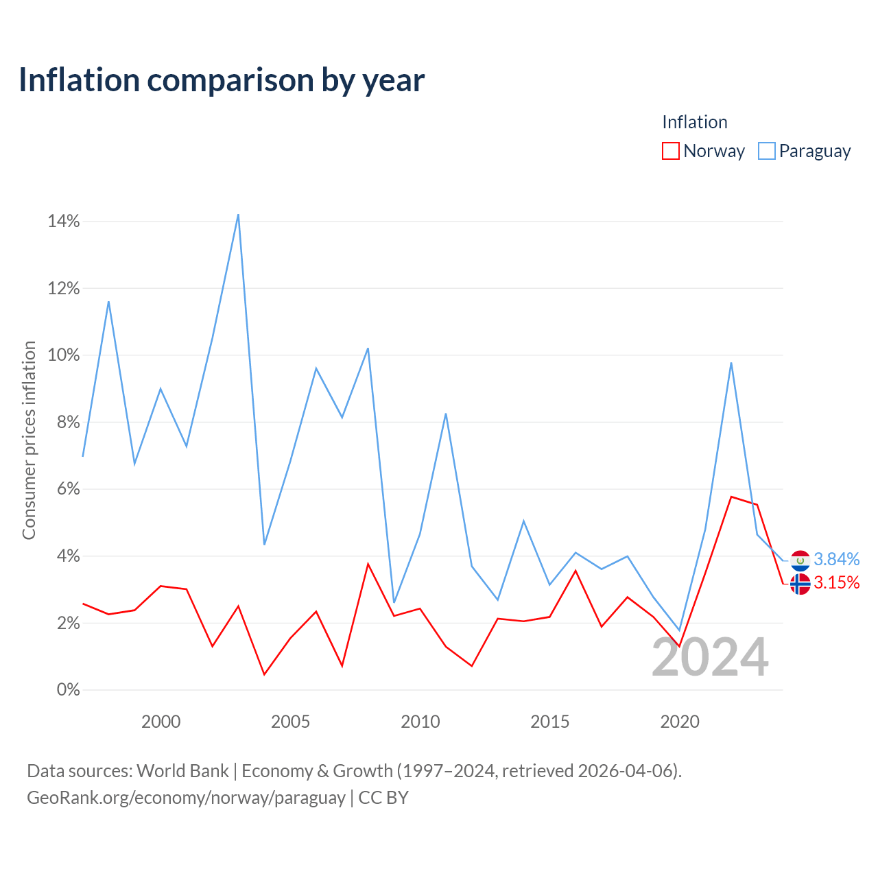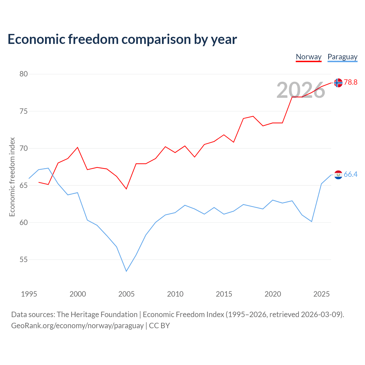 The Economic Freedom Index for Norway is 78.8, ranking 9/197, compared to 66.4 for Paraguay, ranking 61/197. The chart above displays a comparison of annual changes in economic freedom indexes.