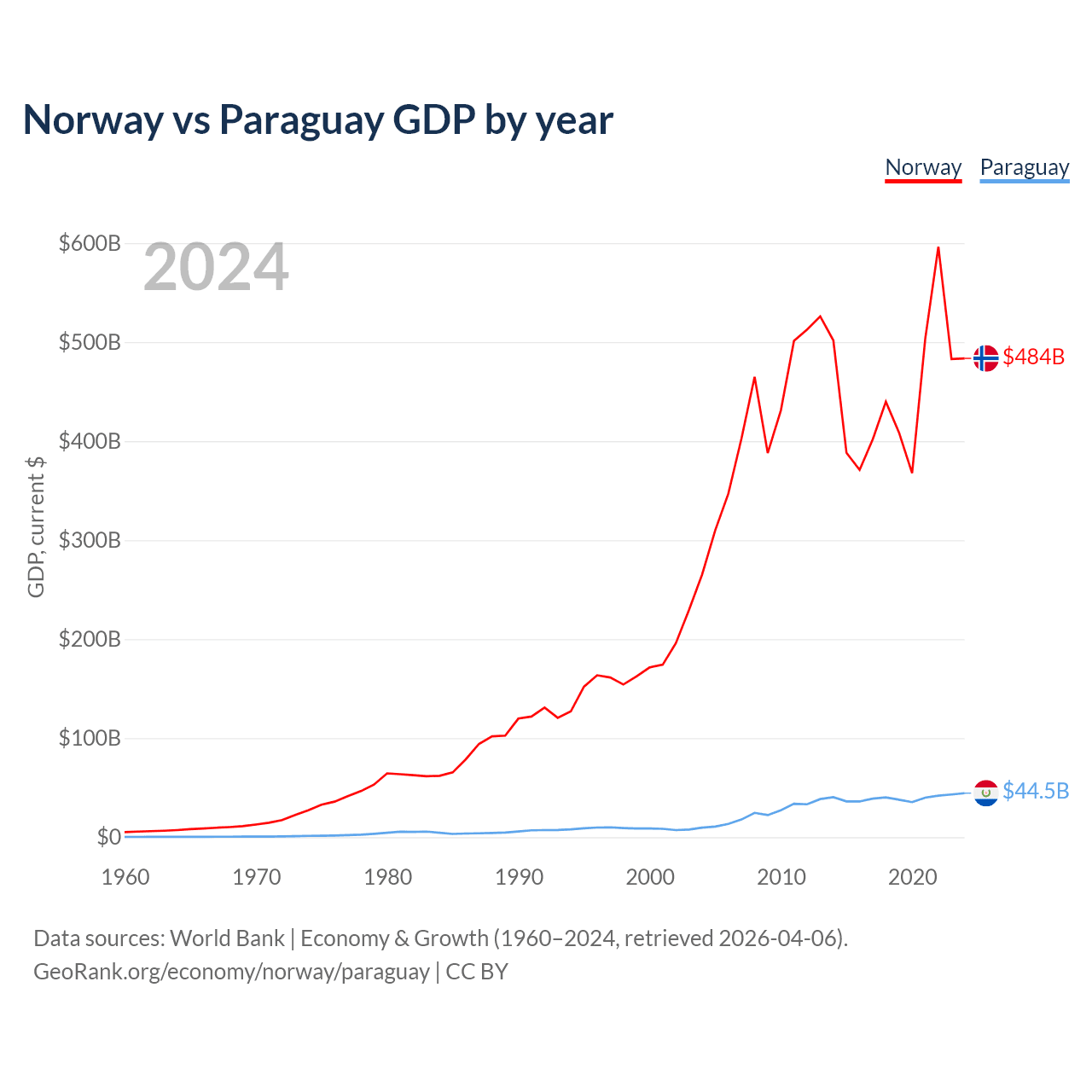 Norway has a GDP of $484B compared to $44.5B for Paraguay, ranking 32/197 and 98/197 by economy size, respectively.