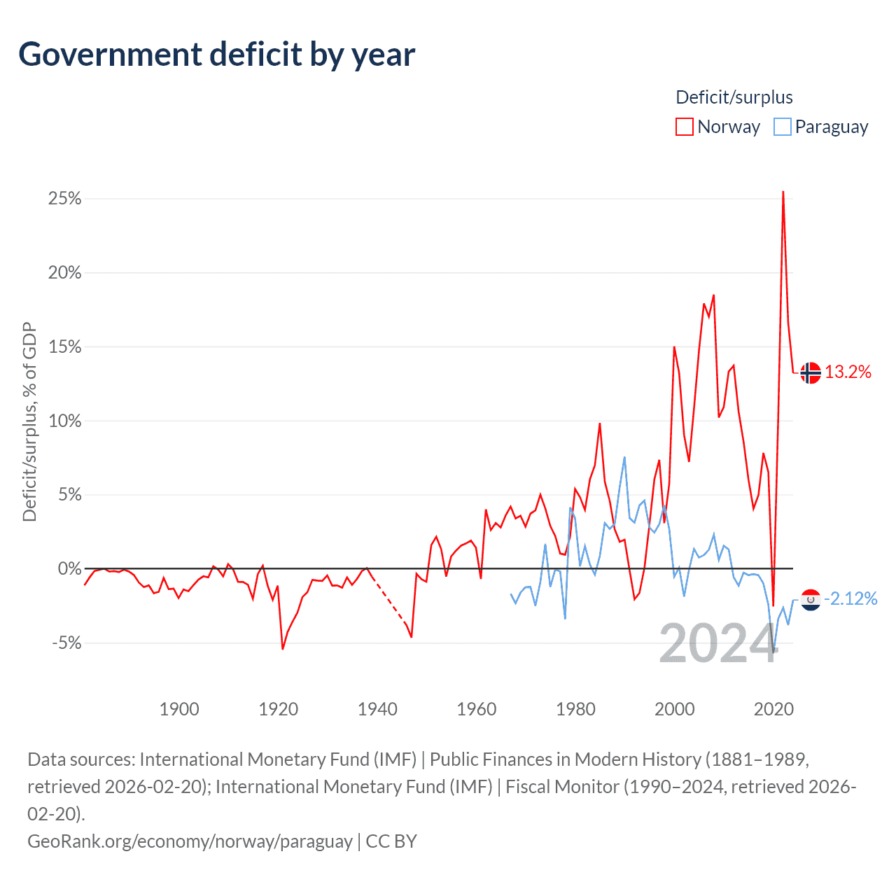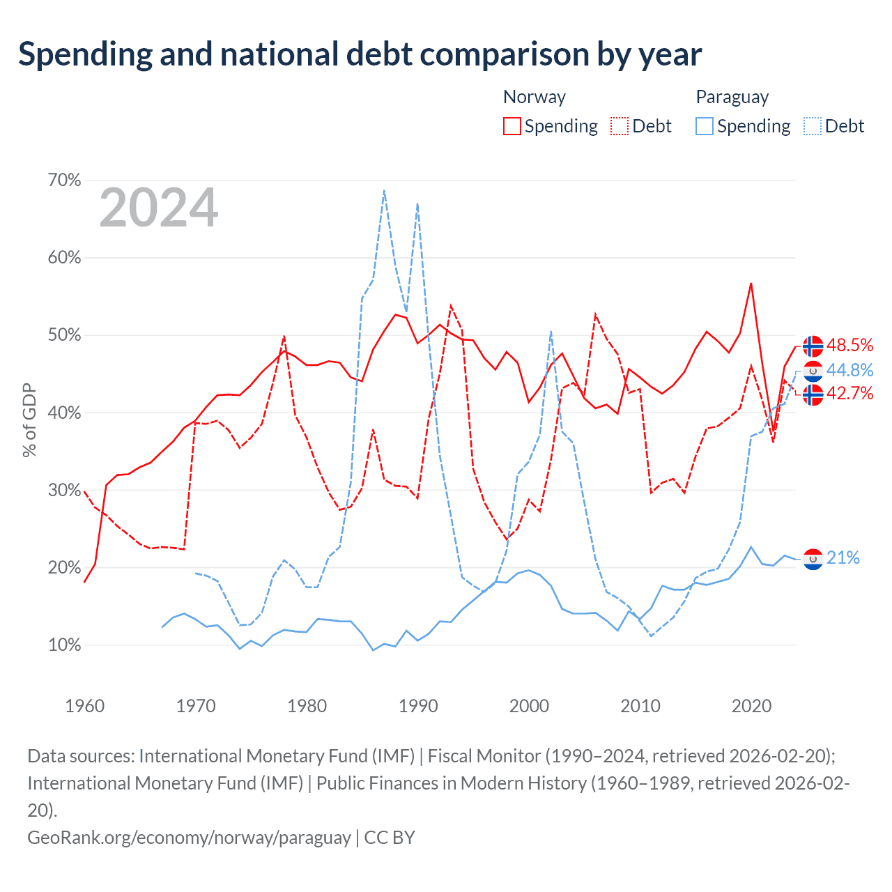 Norway has $207B in government debt (42.7% of GDP), compared to $19.9B (44.8% of GDP) in Paraguay.