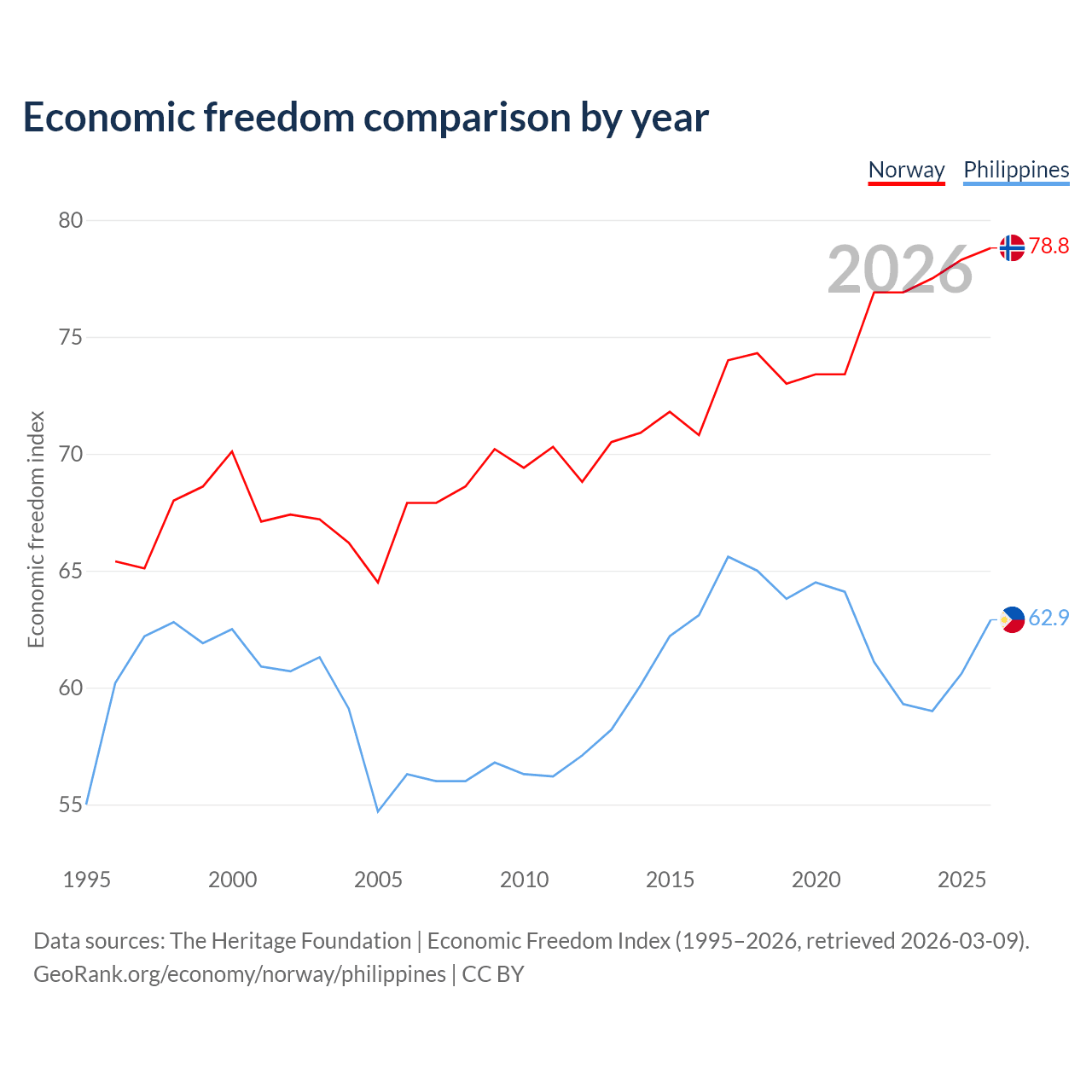 The Economic Freedom Index for Norway is 78.8, ranking 9/197, compared to 62.9 for the Philippines, ranking 85/197. The chart above displays a comparison of annual changes in economic freedom indexes.