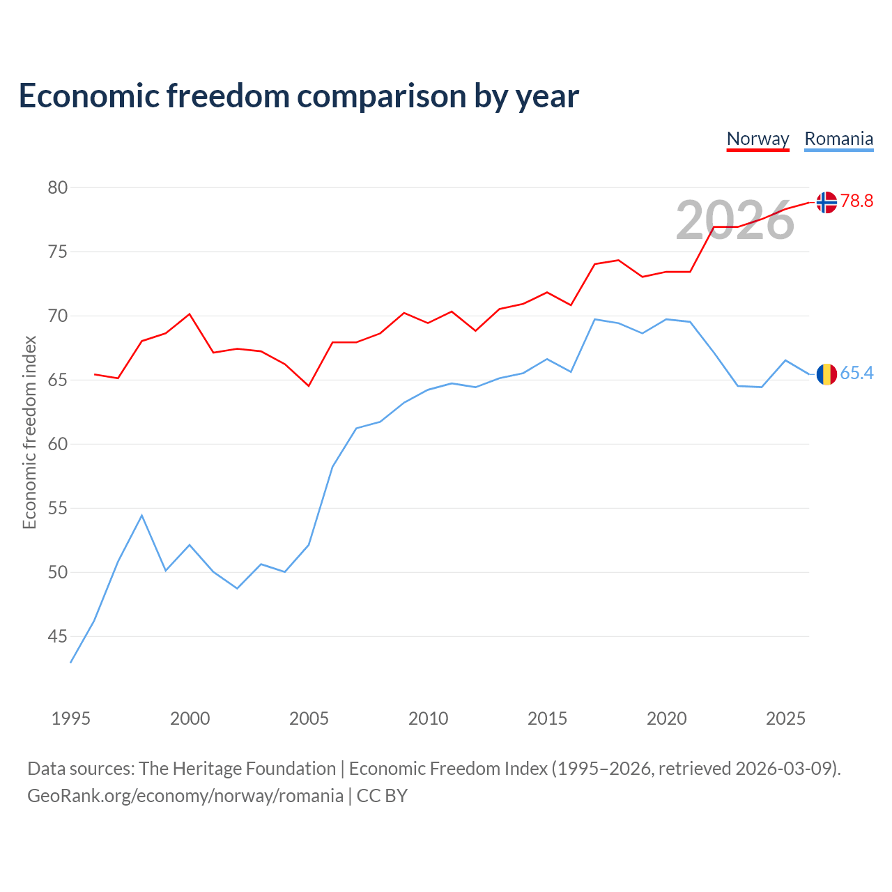 The Economic Freedom Index for Norway is 78.8, ranking 9/197, compared to 65.4 for Romania, ranking 64/197. The chart above displays a comparison of annual changes in economic freedom indexes.