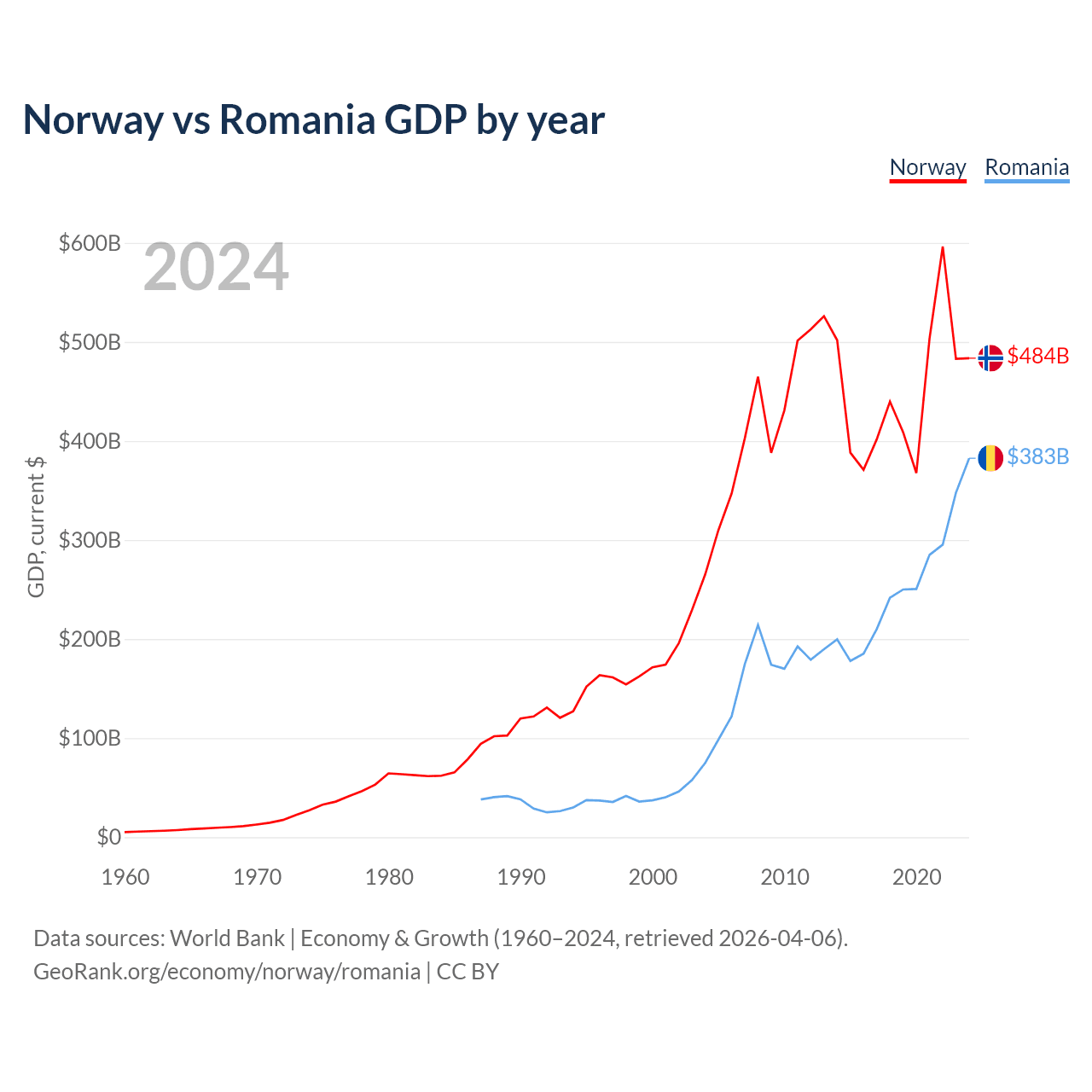 Norway vs Romania GDP by year