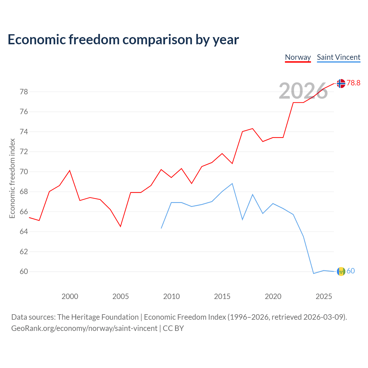 The Economic Freedom Index for Norway is 78.8, ranking 9/197, compared to 60 for Saint Vincent, ranking 98/197. The chart above displays a comparison of annual changes in economic freedom indexes.