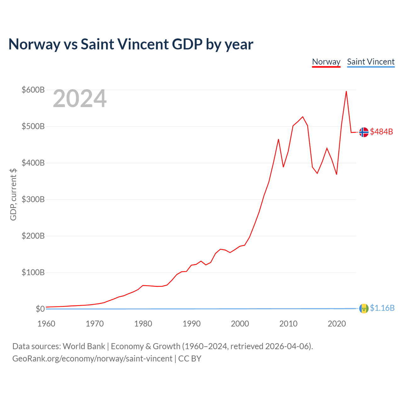 Norway has a GDP of $484B compared to $1.16B for Saint Vincent, ranking 32/197 and 186/197 by economy size, respectively.