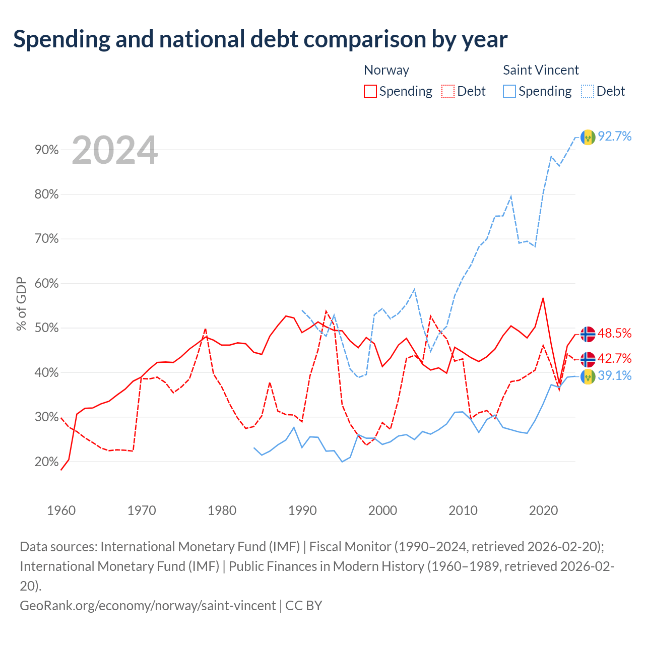 Norway has $207B in government debt (42.7% of GDP), compared to $1.07B (92.7% of GDP) in Saint Vincent.