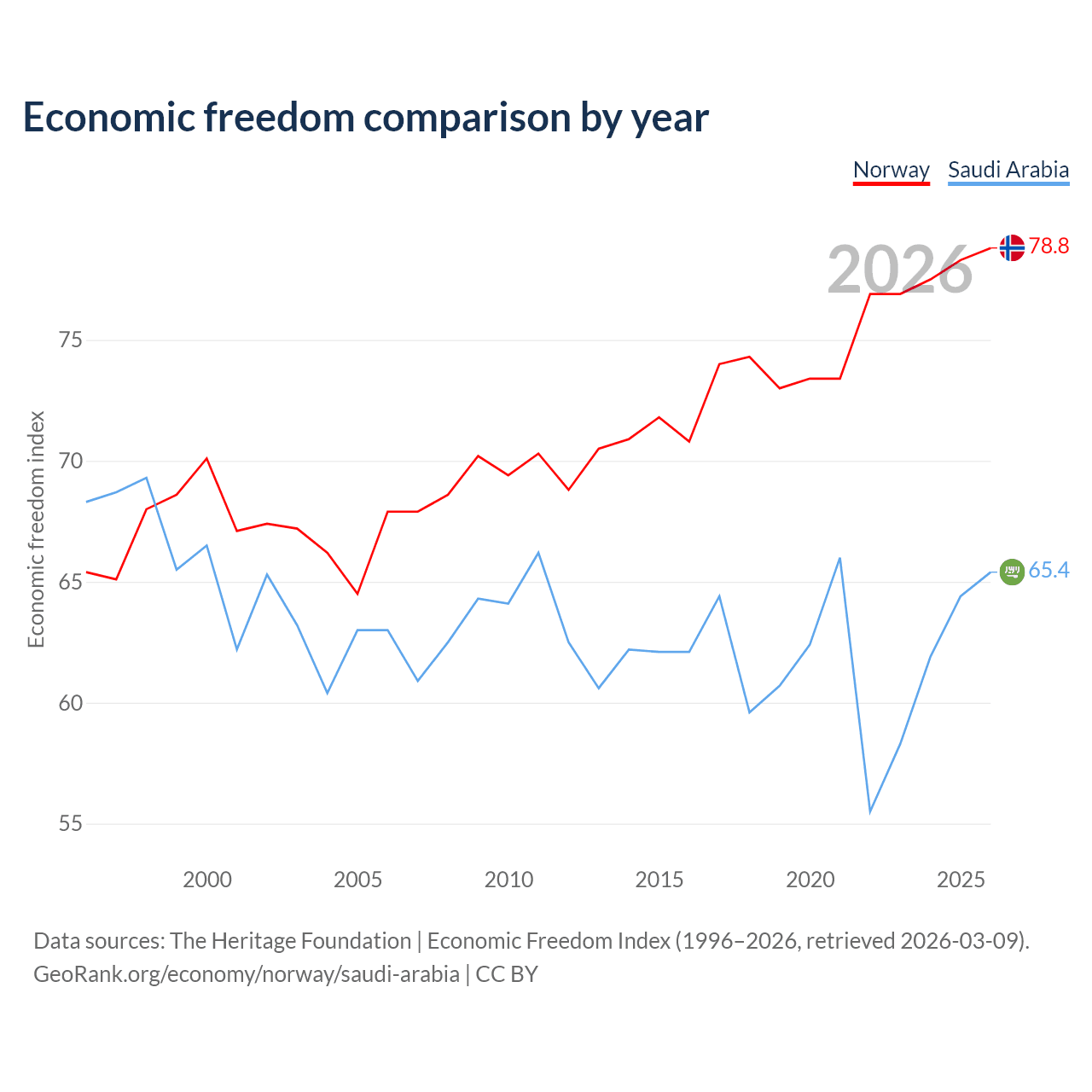 The Economic Freedom Index for Norway is 78.8, ranking 9/197, compared to 65.4 for Saudi Arabia, ranking 65/197. The chart above displays a comparison of annual changes in economic freedom indexes.