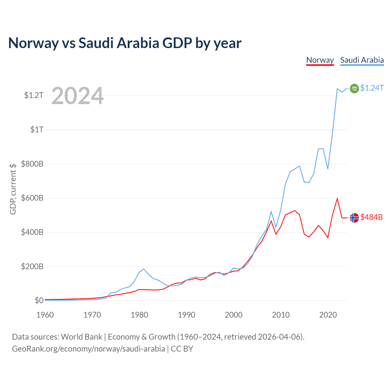 Norway has a GDP of $484B compared to $1.24T for Saudi Arabia, ranking 32/197 and 18/197 by economy size, respectively.