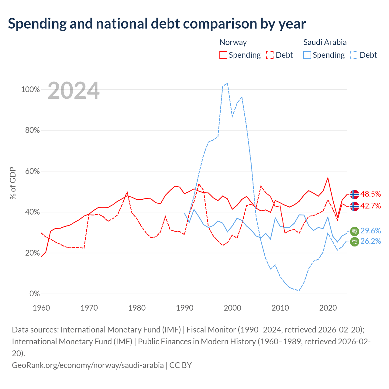 Norway has $207B in government debt (42.7% of GDP), compared to $324B (26.2% of GDP) in Saudi Arabia.