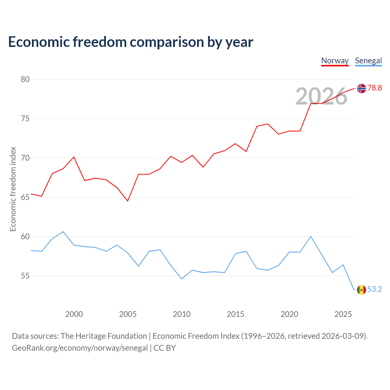 The Economic Freedom Index for Norway is 78.8, ranking 9/197, compared to 53.2 for Senegal, ranking 140/197. The chart above displays a comparison of annual changes in economic freedom indexes.