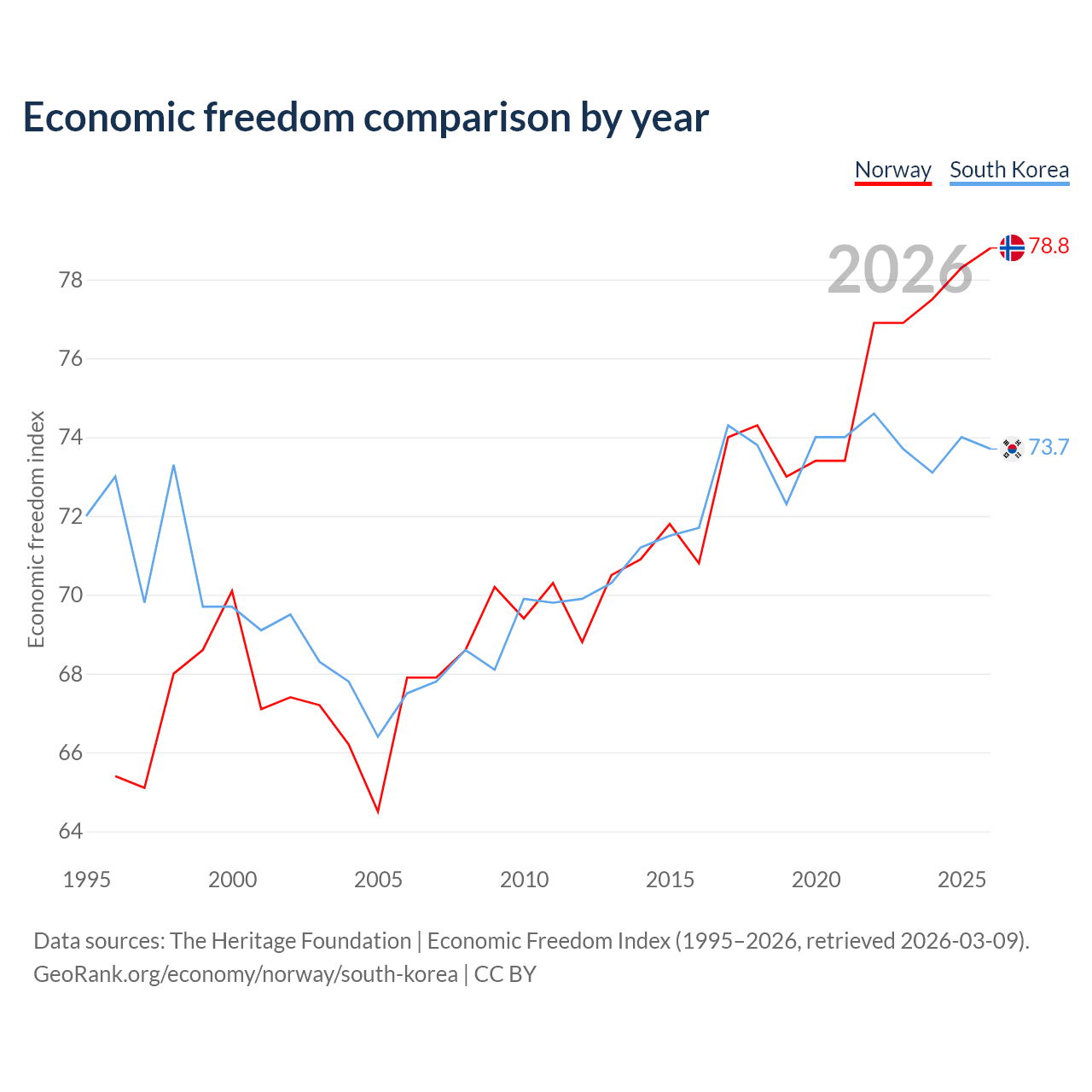 The Economic Freedom Index for Norway is 78.8, ranking 9/197, compared to 73.7 for South Korea, ranking 24/197. The chart above displays a comparison of annual changes in economic freedom indexes.