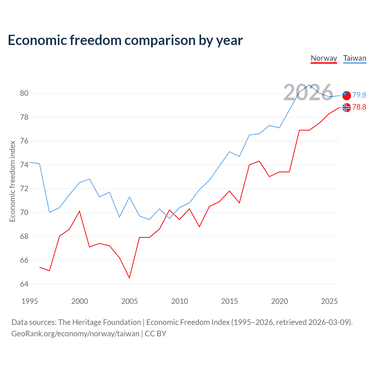 The Economic Freedom Index for Norway is 78.8, ranking 9/197, compared to 79.8 for Taiwan, ranking 6/197. The chart above displays a comparison of annual changes in economic freedom indexes.