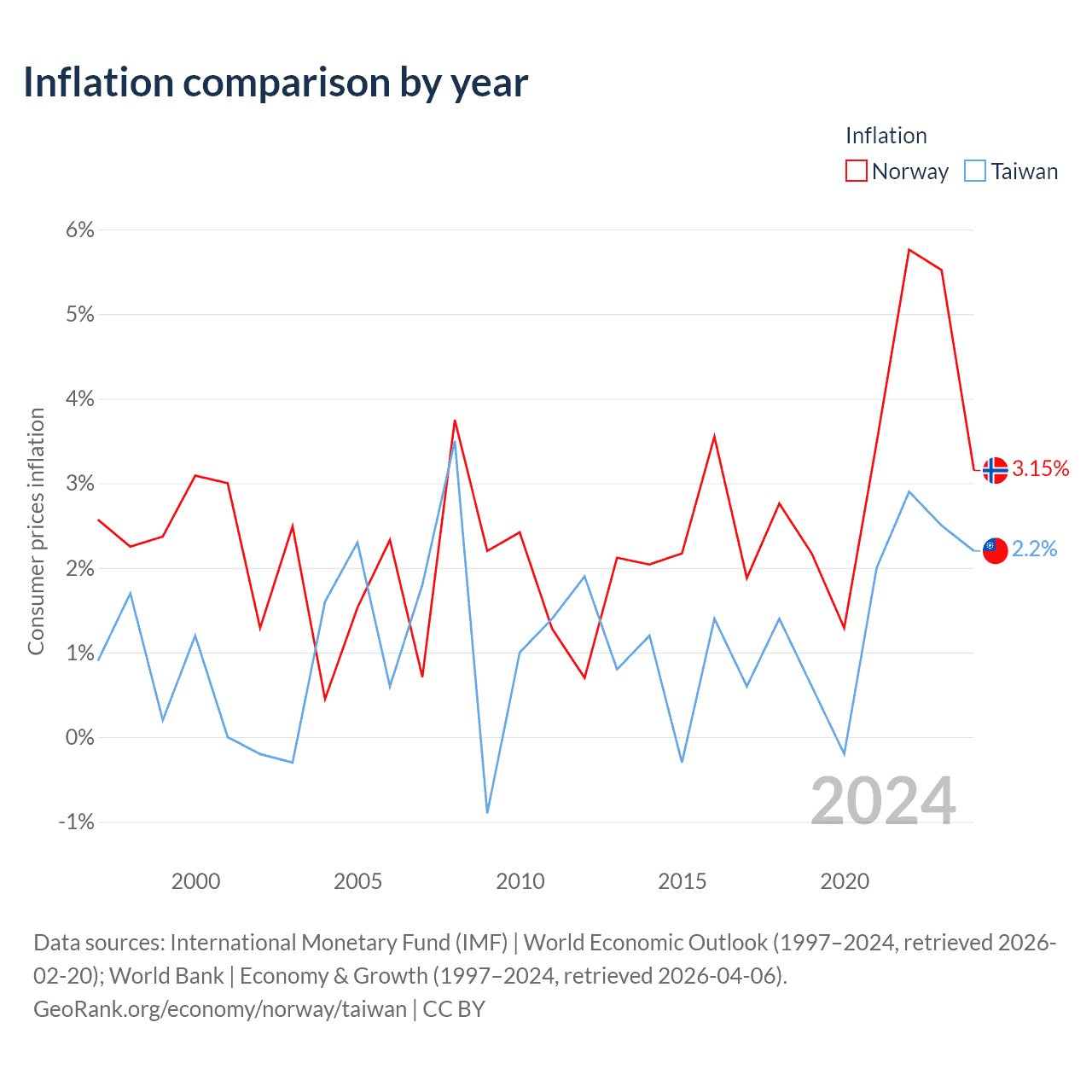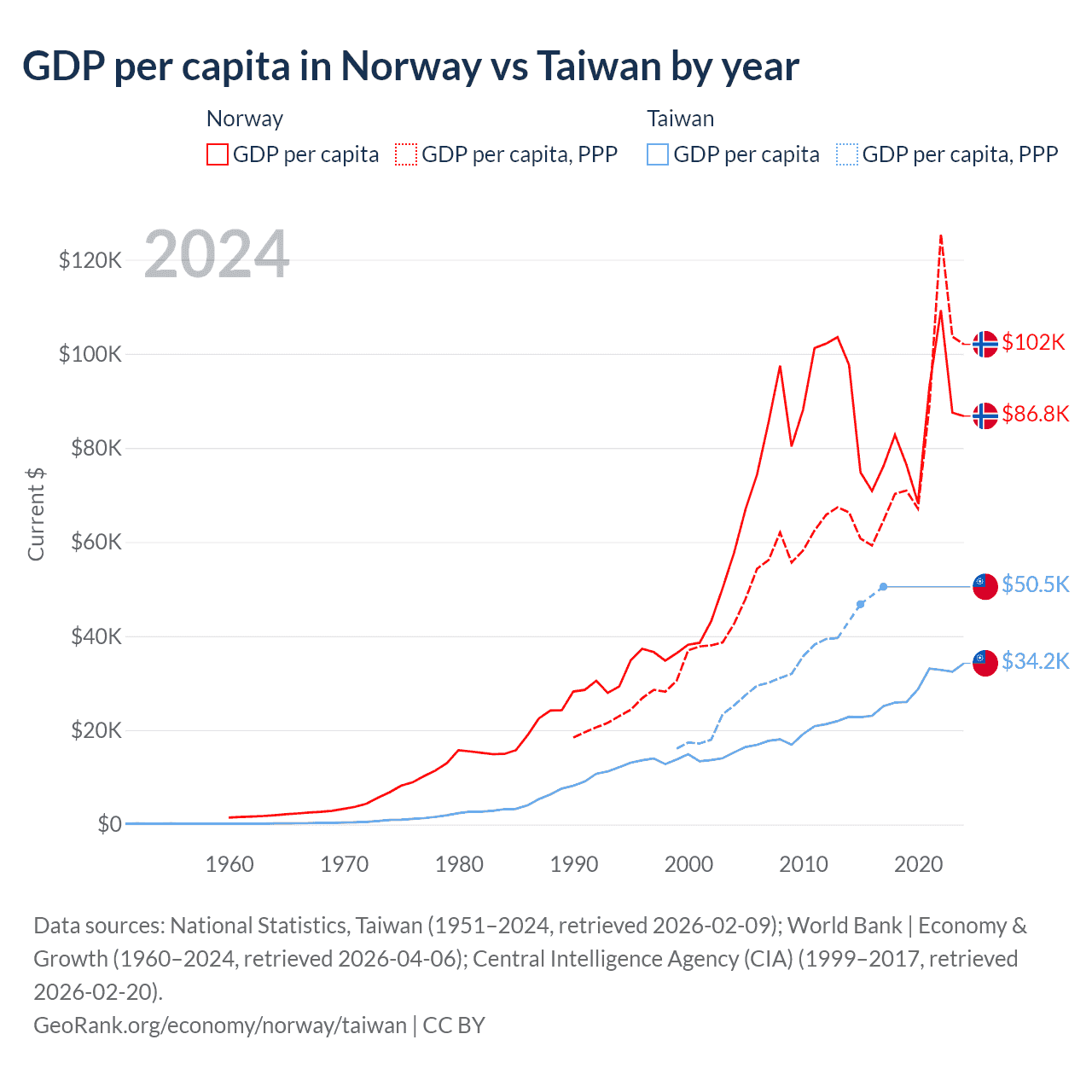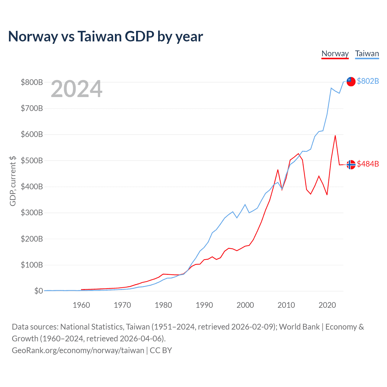 Norway has a GDP of $484B compared to $802B for Taiwan, ranking 32/197 and 22/197 by economy size, respectively.