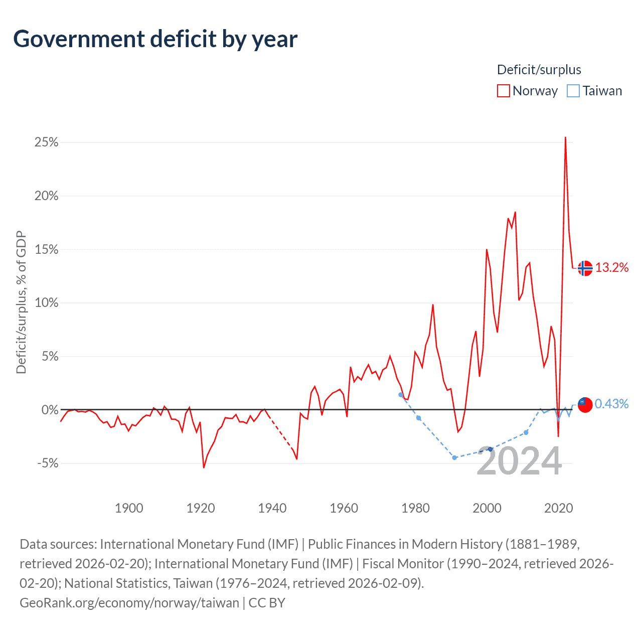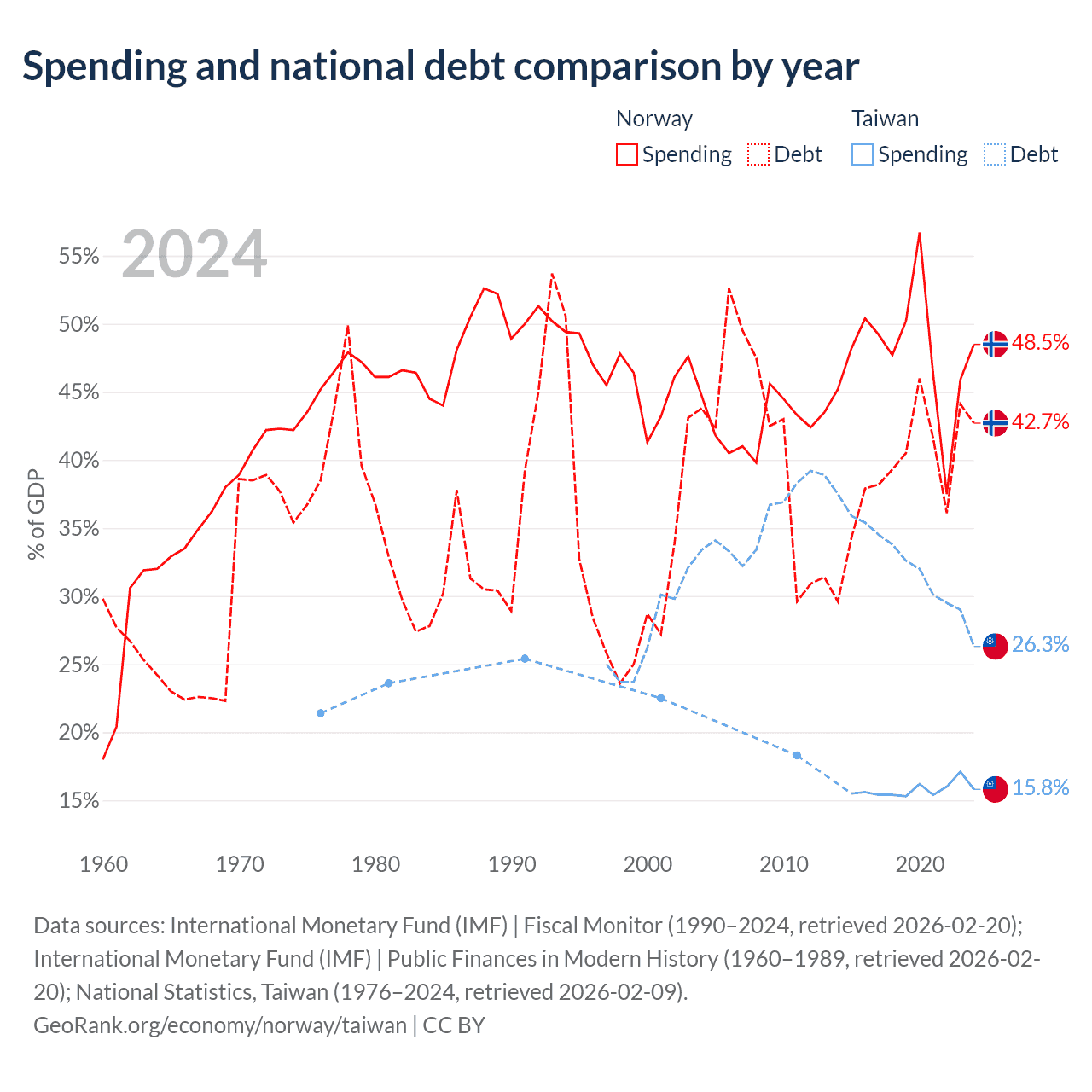Norway has $207B in government debt (42.7% of GDP), compared to $211B (26.3% of GDP) in Taiwan.