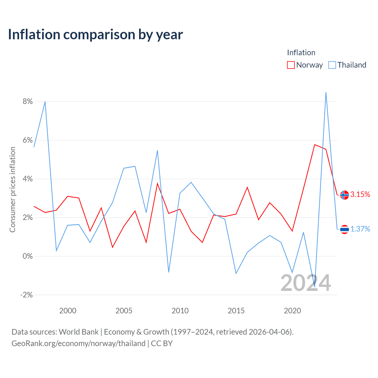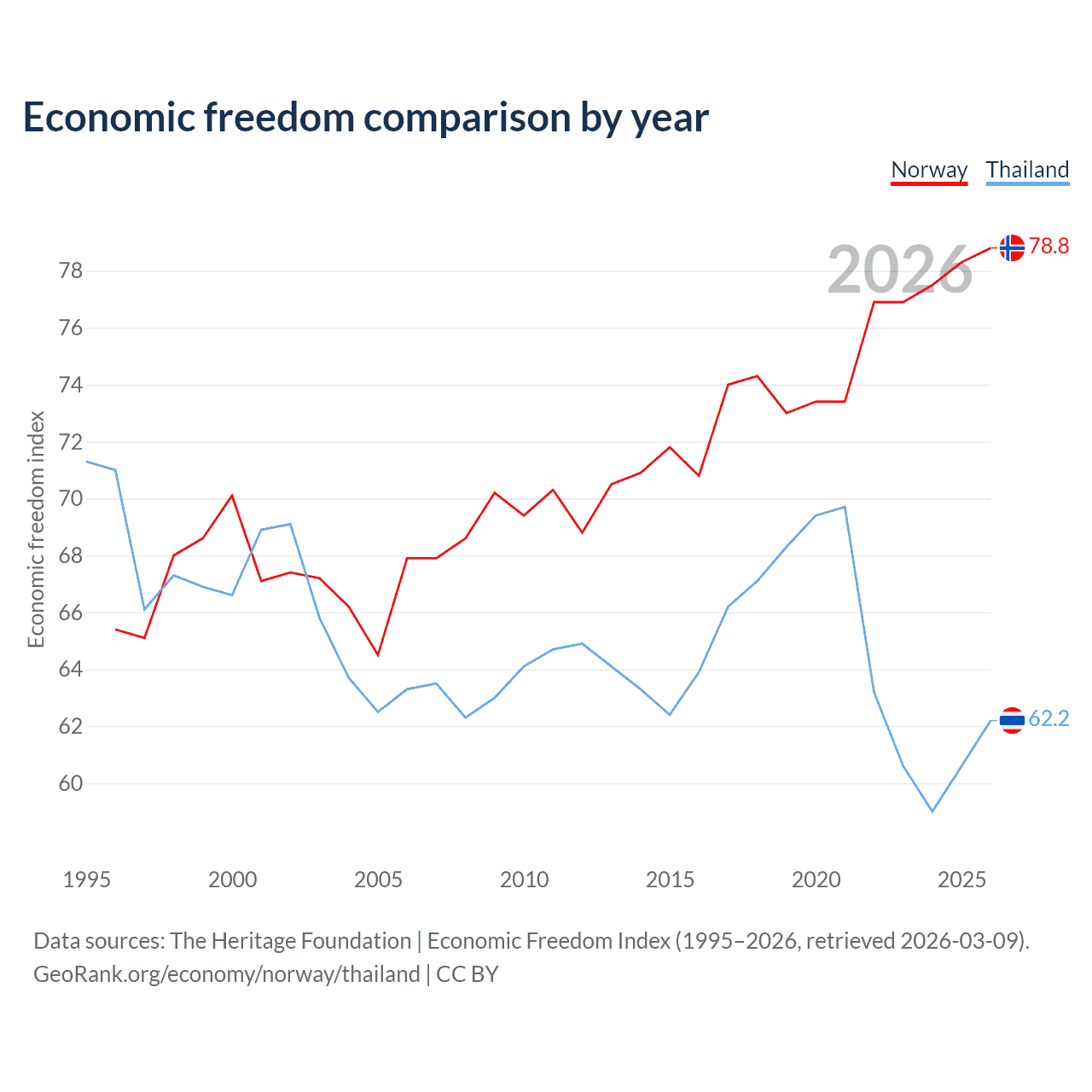 The Economic Freedom Index for Norway is 78.8, ranking 9/197, compared to 62.2 for Thailand, ranking 88/197. The chart above displays a comparison of annual changes in economic freedom indexes.