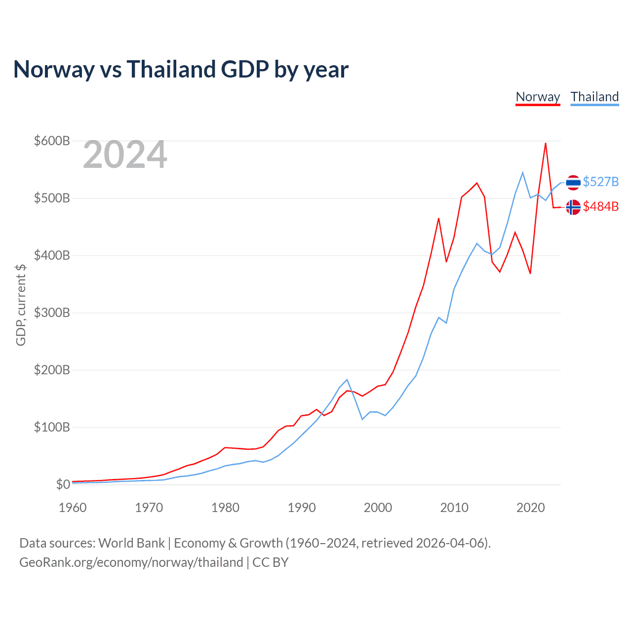 Norway has a GDP of $484B compared to $527B for Thailand, ranking 32/197 and 31/197 by economy size, respectively.