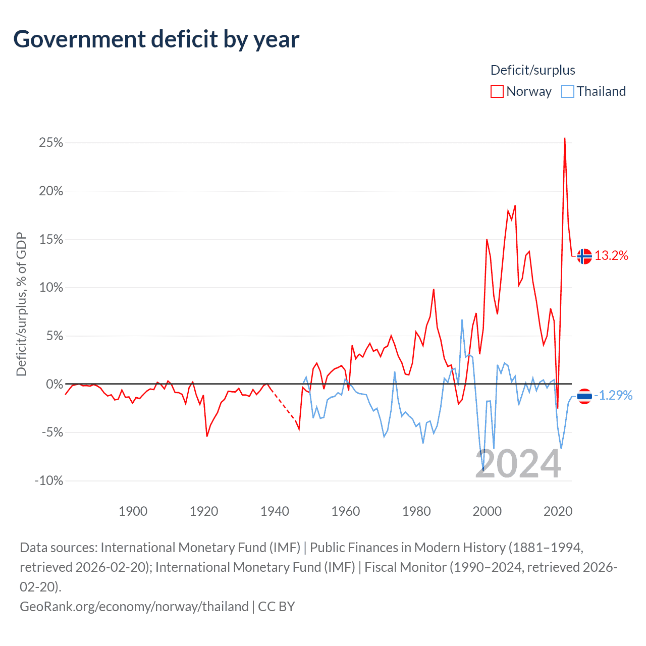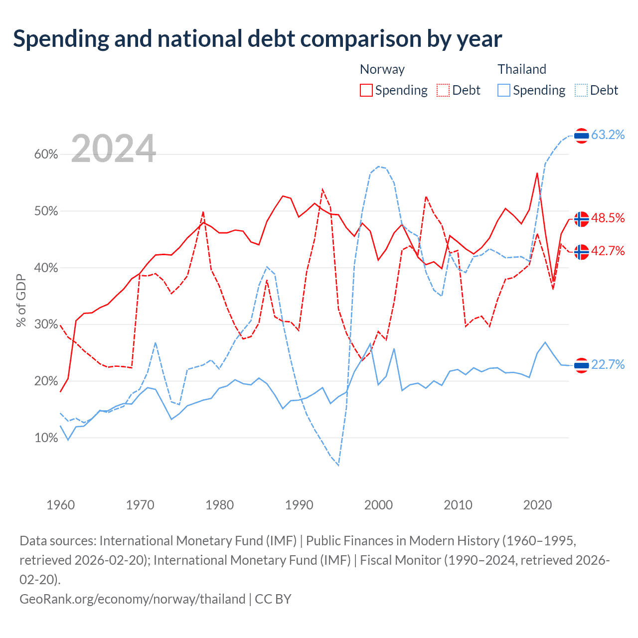 Norway has $207B in government debt (42.7% of GDP), compared to $333B (63.2% of GDP) in Thailand.